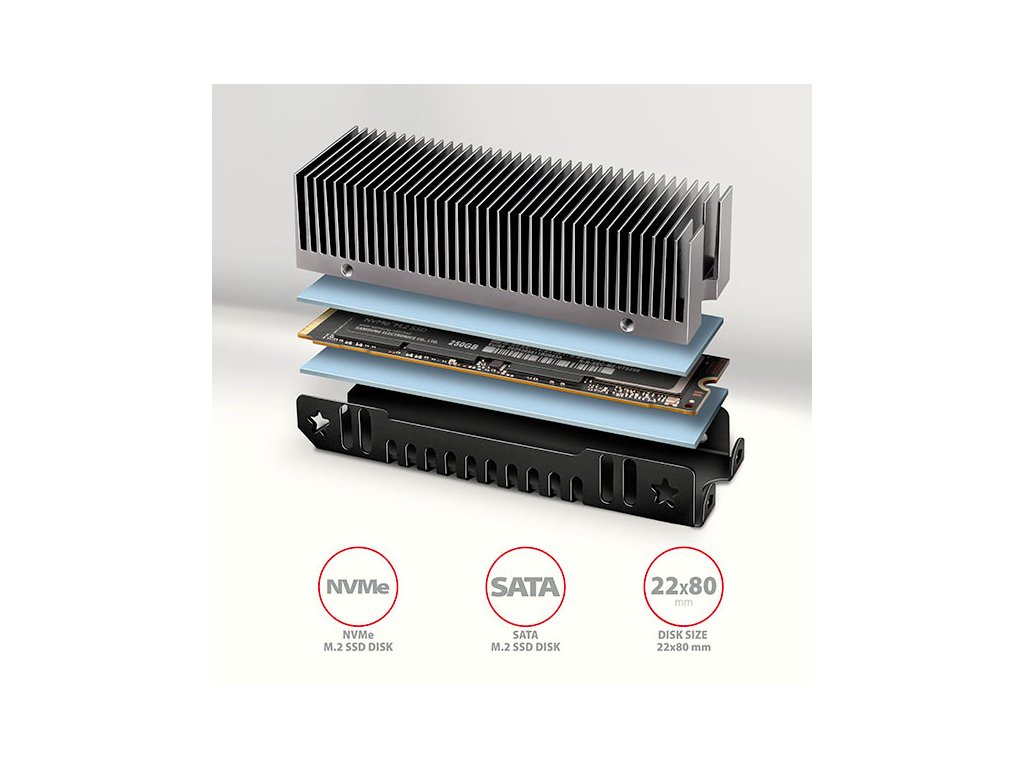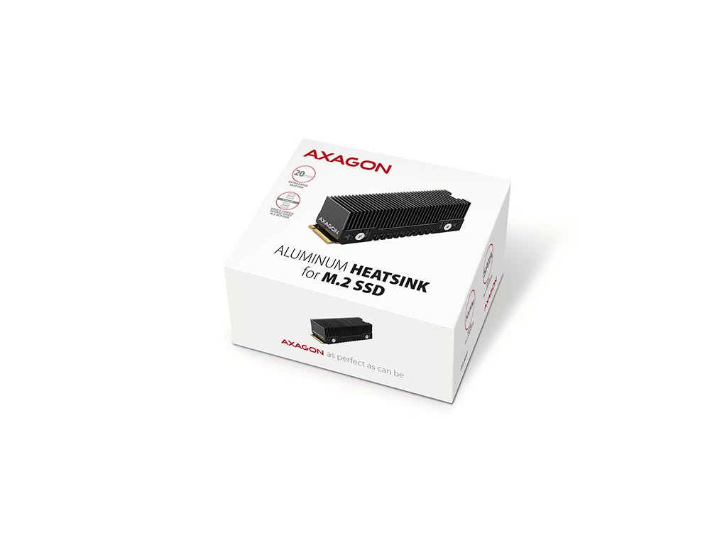 Chladič lze použít nejen s M.2 adaptéry AXAGON, ale také s M.2 (NGFF) sloty na základních deskách apod. Díky velké chladící ploše a kovovému rámečku efektivně odvádí teplo z obou stran M.2 disku, čímž dosahuje maximální účinnosti chlazení. Tento chladič je díky své vysoké účinnosti chlazení jedním z nejvýkonnějších modelů chladičů značky AXAGON.