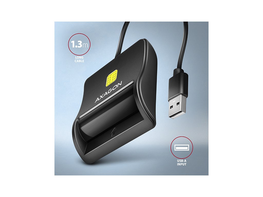 Kompaktní stolní čtečka Smart card / ID card AXAGON CRE-SM3N FlatReader s USB 2.0 rozhraním. Card reader podporuje všechny běžné formáty kontaktních Smart karet, čipových karet a dalších karet včetně kontaktních bankovních platebních karet nebo kontaktních elektronických občanských průkazů *. Čtečka je plně kompatibilní s aplikací eObčanka.Kompatibilita se všemi běžnými OS jako Windows, Linux, Mac OS a Android umožňuje široké využití jak na stolních počítačích a noteboocích, tak na telefonech a tabletech. Chytrá LED indikace svítí jen krátkou chvíli po změně aktivity, poté zhasne a neruší uživatele zbytečným svitem. Kompaktní design, kvalitní provedení, protiskluzová podložka a dostatečně dlouhý kabel zajišťují snadné a bezproblémové použití.