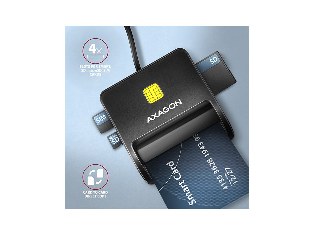 Kompaktní stolní čtečka Smart card / ID card AXAGON CRE-SM3SD FlatReader s USB 2.0 rozhraním obsahuje navíc sloty pro paměťové karty SD, microSD a SIM karty. Card reader podporuje všechny běžné formáty kontaktních Smart karet, čipových karet a dalších karet včetně kontaktních bankovních platebních karet nebo kontaktních elektronických občanských průkazů *. Čtečka je plně kompatibilní s aplikací eObčanka.Díky slotu pro SIM kartu včetně SW pro správu SIM, slotům pro SD a microSD karty lze čtečku využít i pro zálohu a přenos dat.