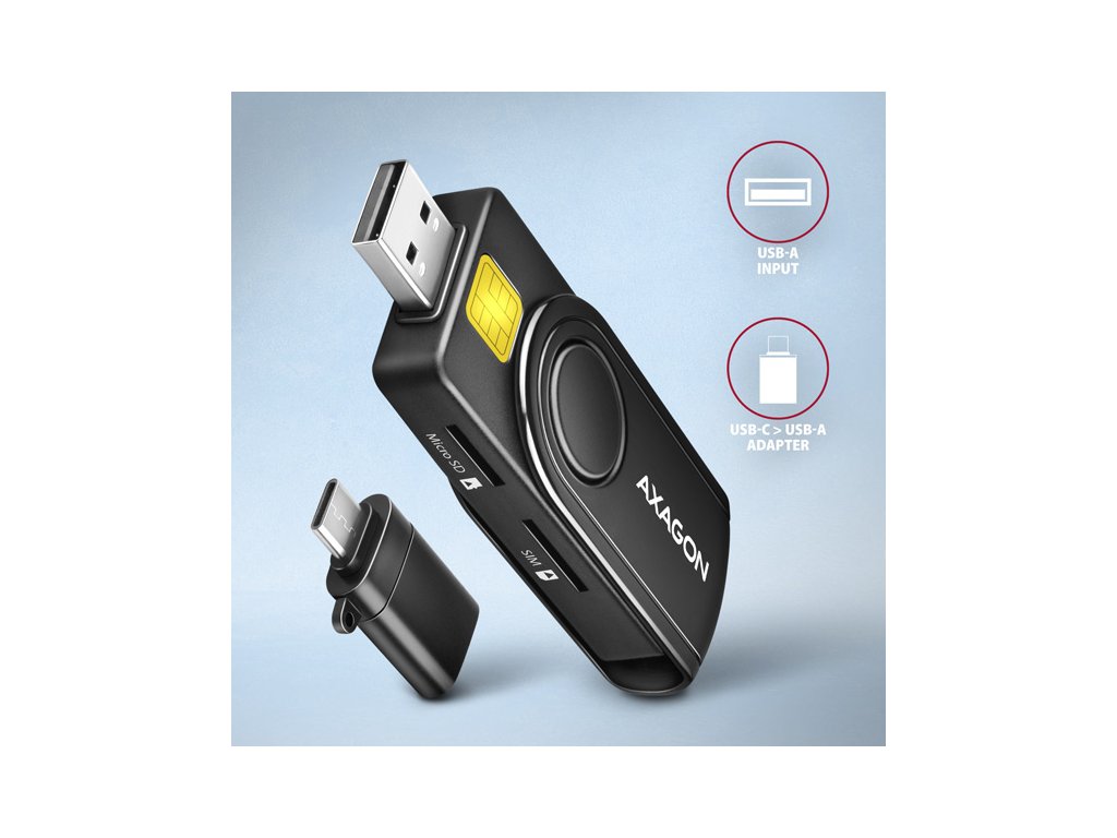 Součástí balení je také USB-C <> USB-A adaptér pro připojení k zařízením s USB-C konektorem. Otočná krytka napomáhá ochraně USB-A konektoru. Kompaktní design a kvalitní provedení dělá z této čtečky jednu z nejmenších kombinovaných čteček Smart karet a paměťových karet na trhu.