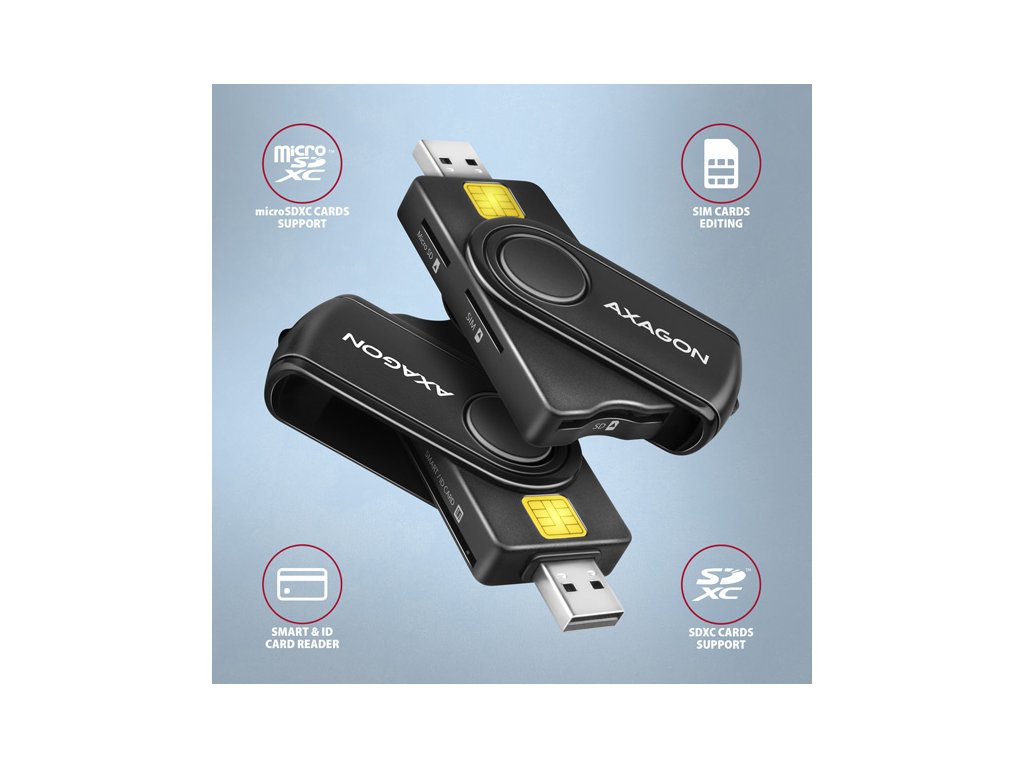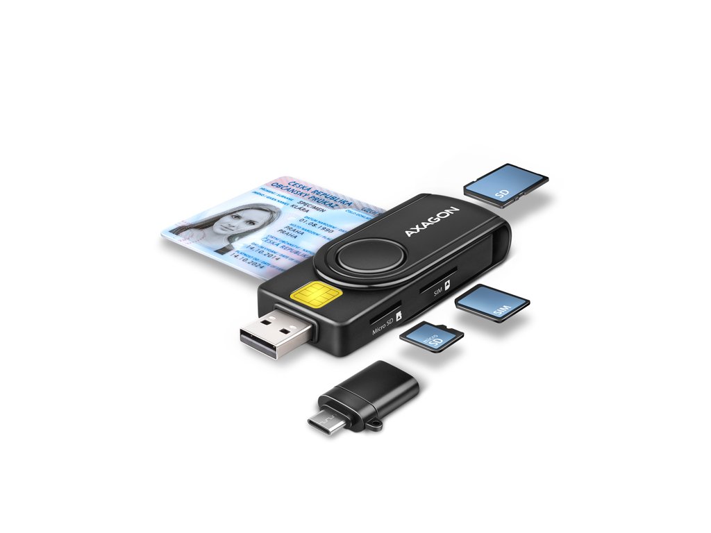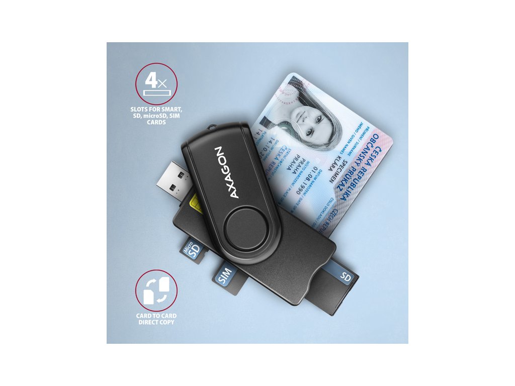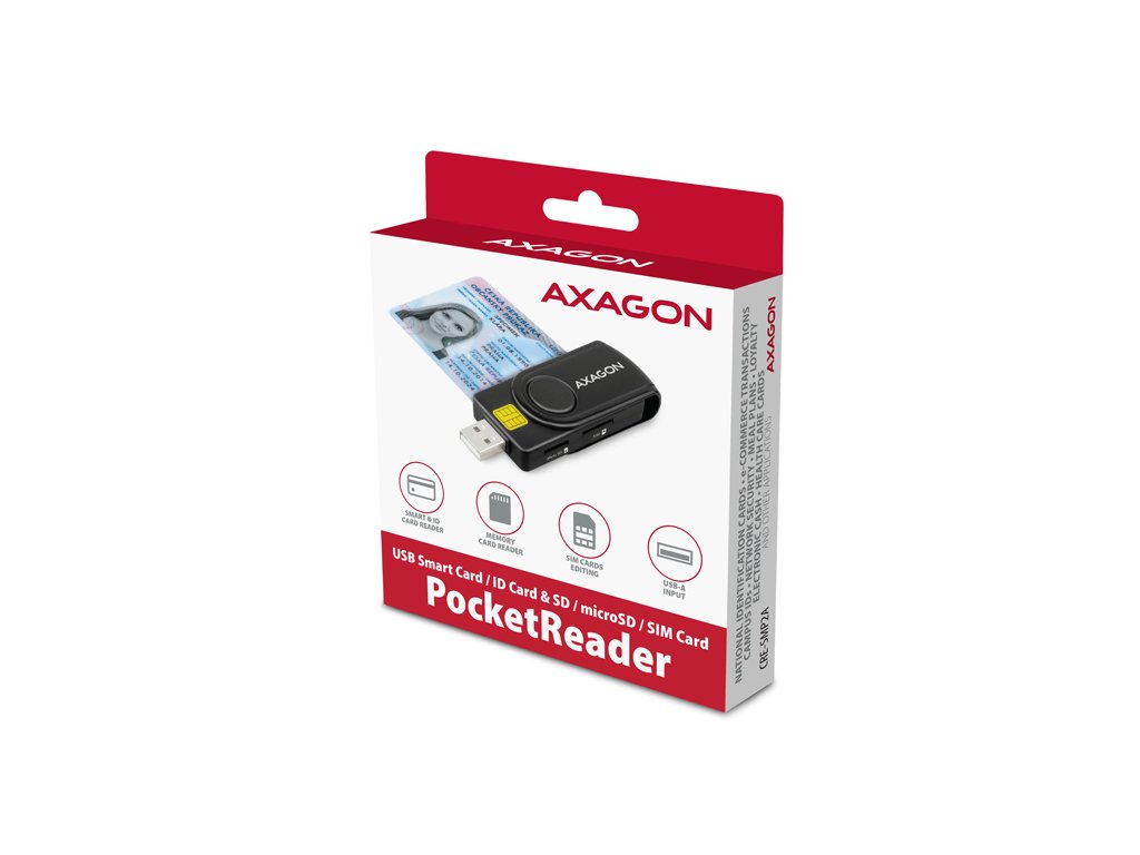 Kompaktní cestovní čtečka Smart card / ID card AXAGON CRE-SMP2A PocketReader s USB 2.0 rozhraním obsahuje navíc sloty pro paměťové karty SD, microSD a SIM karty. Card reader podporuje všechny běžné formáty kontaktních Smart karet, čipových karet a dalších karet včetně kontaktních bankovních platebních karet nebo kontaktních elektronických občanských průkazů. Čtečka je plně kompatibilní s aplikací eObčanka (CZ), nebo eID klient (SK).Díky slotu pro SIM kartu včetně SW pro správu SIM, slotům pro SD a microSD karty lze čtečku využít i pro zálohu a přenos dat.