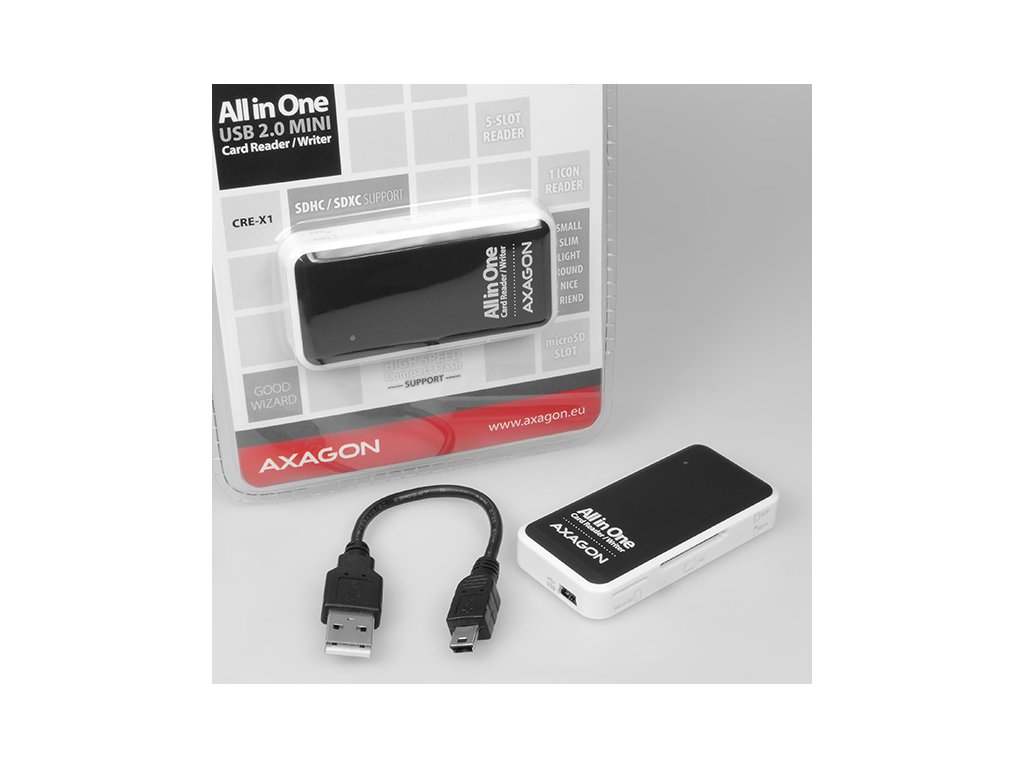 Velmi kompaktní all-in-one čtečka paměťových karet AXAGON CRE-X1 MINI podporuje všechny současné paměťové karty včetně všech verzí karet SDHC a SDXC.Je vybavená pátým slotem pro přímou podporu populárních miniaturních microSD karet.