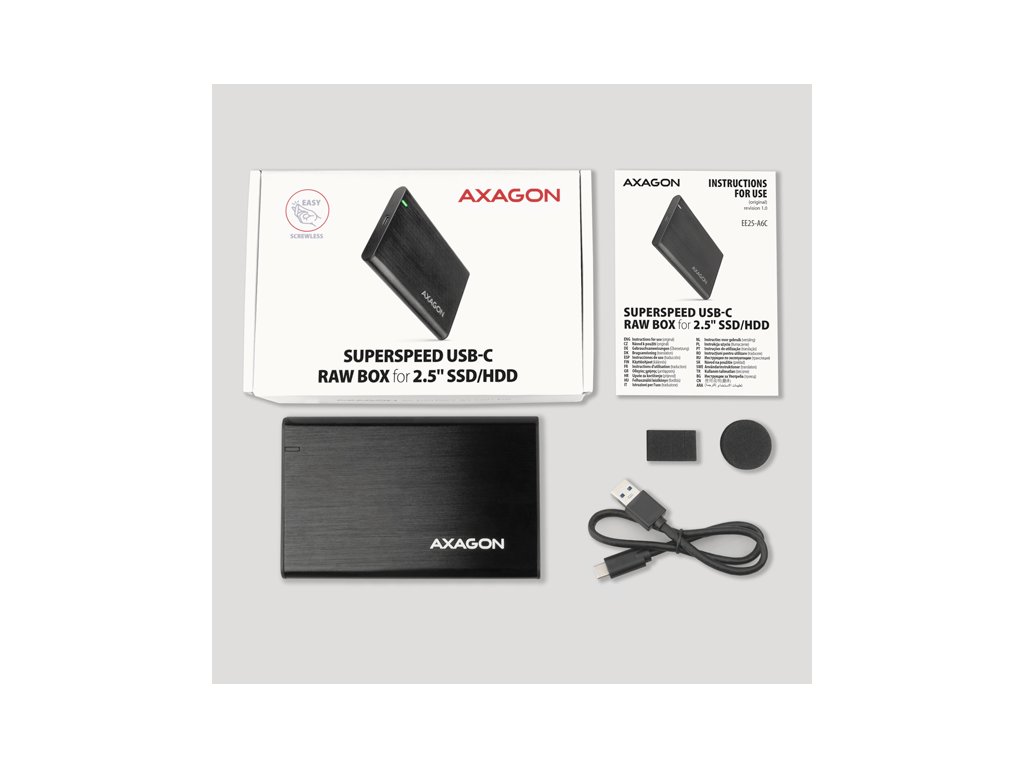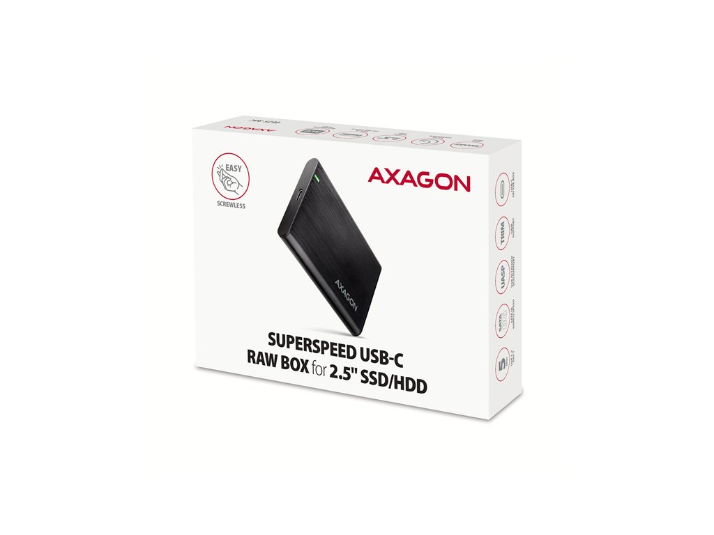 Bezšroubkový hliníkový externí AXAGON EE25-A6C RAW box s USB 3.2 Gen 1 (USB 3.0) rozhraním určený pro 2.5" SATA pevné disky nebo SSD. Spolehlivé připojení k počítači umožňuje oboustranný USB-C konektor na boxu spolu s dodávaným kabelem USB-C -> USB-A.SATA 6G rozhraní s podporou UASP dovolí užívat si rychlost moderních SSD disků. Podpora funkce TRIM pro omezení pozvolné degradace výkonu SSD v čase. Čtení S.M.A.R.T. informací monitorujících stav disku. Podpora uspávání připojeného disku i boxu.
