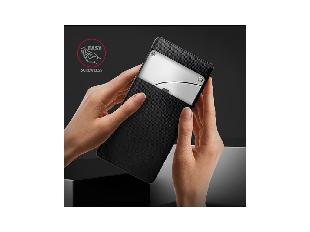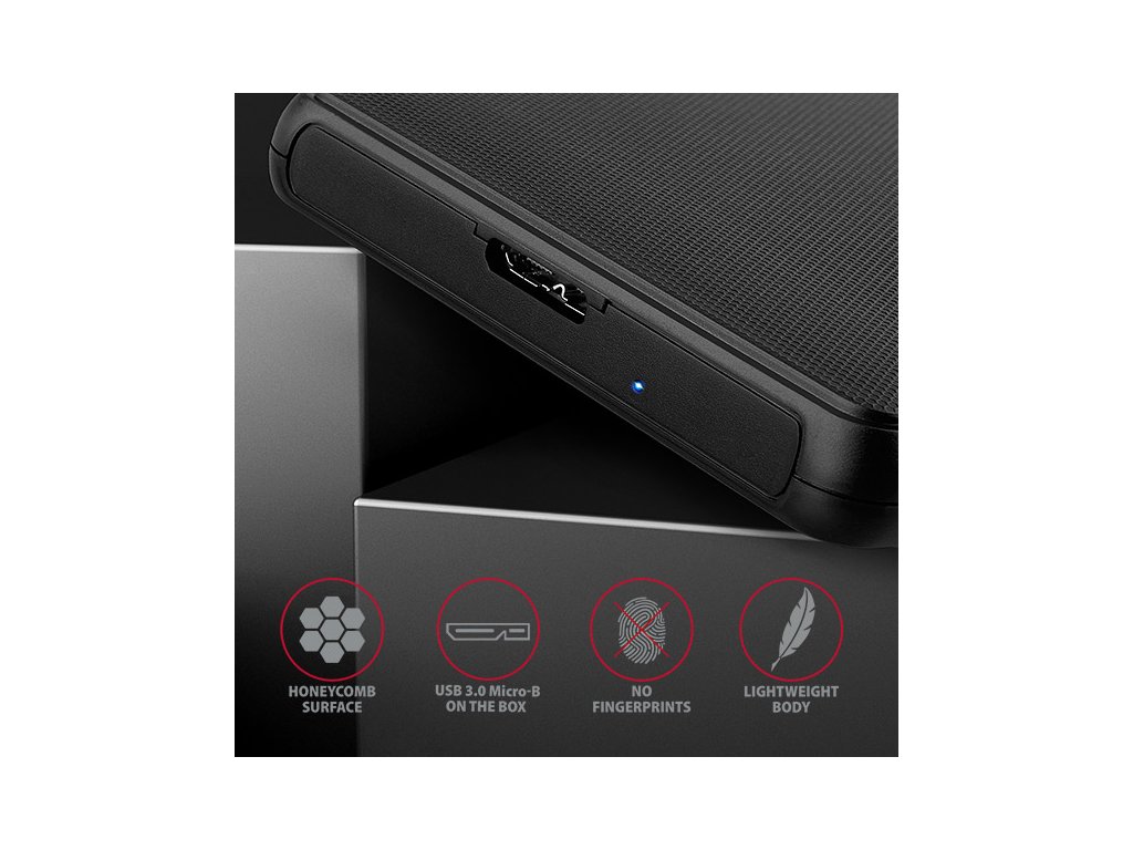 Plastové tělo boxu umožňuje snadnou výměnu disku bez potřeby šroubování. Decentně vroubkovaný povrch krytu je odolný proti poškrábání a brání nežádoucím otiskům prstů. Pěnové výplně uvnitř boxu fixují a chrání vložený disk.