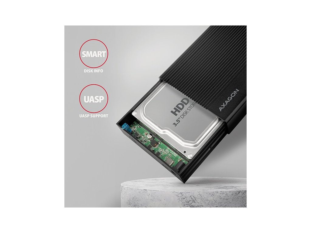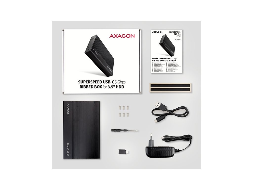 Žebrovaný hliníkový externí AXAGON EE35-GTR RIBBED box s USB-C 5Gbps rozhraním určený pro 3.5" SATA pevné disky. Spolehlivé připojení k počítači umožňuje oboustranný USB-C konektor na boxu spolu s dodávaným kabelem USB-C -> USB-A a redukcí USB-A -> USB-C.Díky USB 3.2 Gen 1 rozhraní je přenosová rychlost až 5 Gb/s. SATA 6G rozhraní s podporou UASP dovolí užívat si rychlost moderních disků. Čtení S.M.A.R.T. informací monitorujících stav disku. Podpora uspávání připojeného disku i boxu.