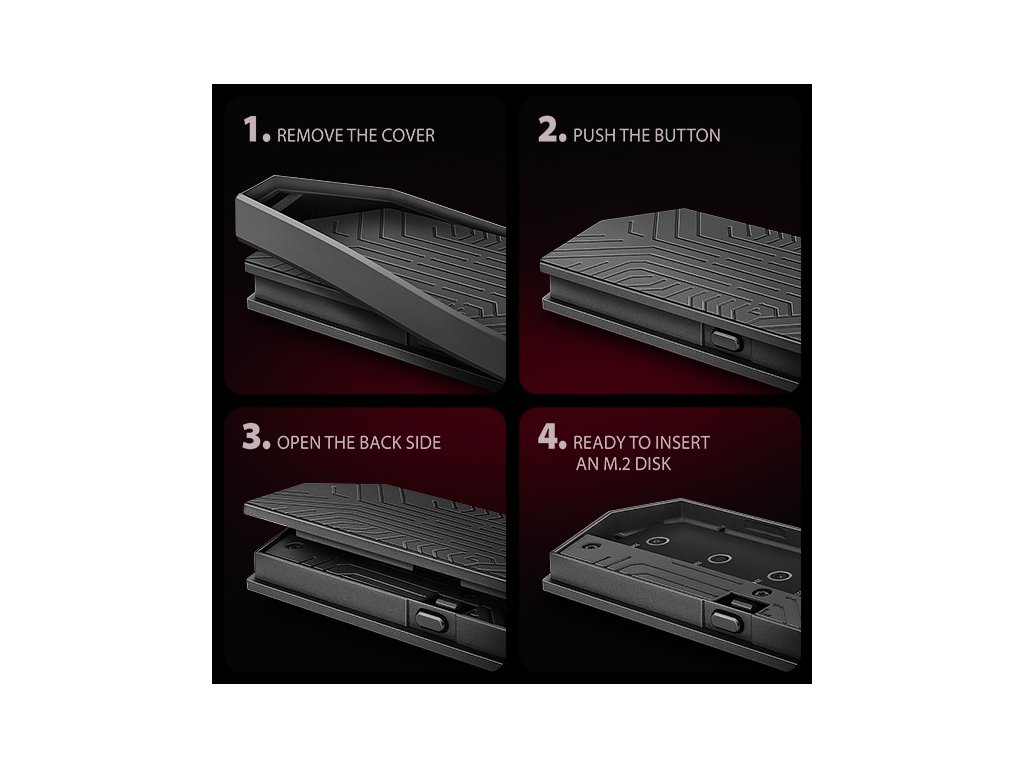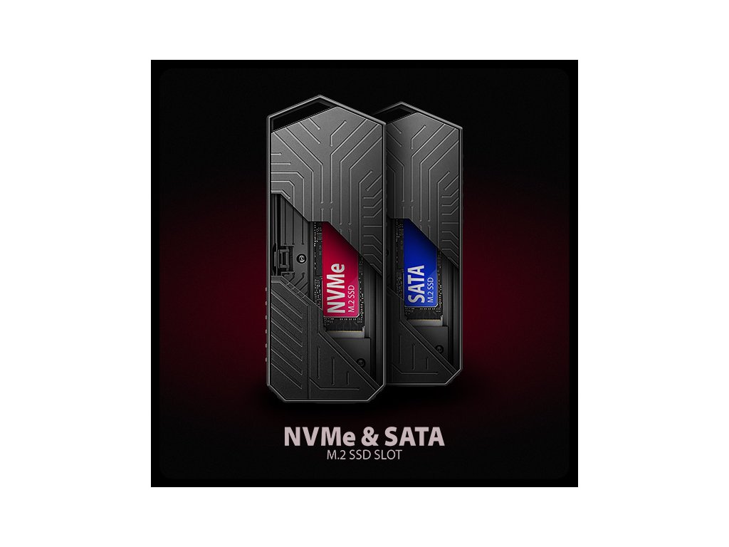 Unikátní vlastností, díky použitému čipsetu, je možnost použití jak M.2 NVMe tak i SATA disků. Nemusíte tak přemýšlet jaký typ M.2 disku do boxu vložíte. Výhodou je uchycení rovnou pro čtyři různé délky SSD karet – 30, 42, 60 a 80 mm. M.2 karty mohou být jednostranné nebo oboustranné. Box nemá omezení kapacity vloženého SSD disku.