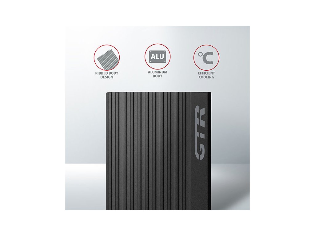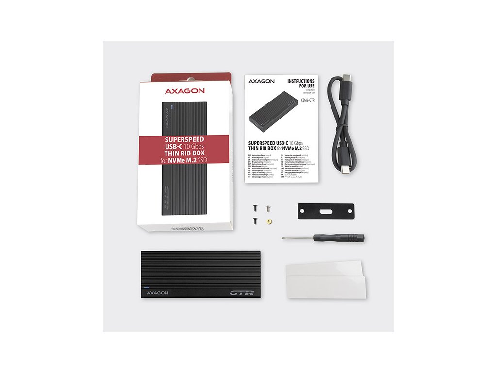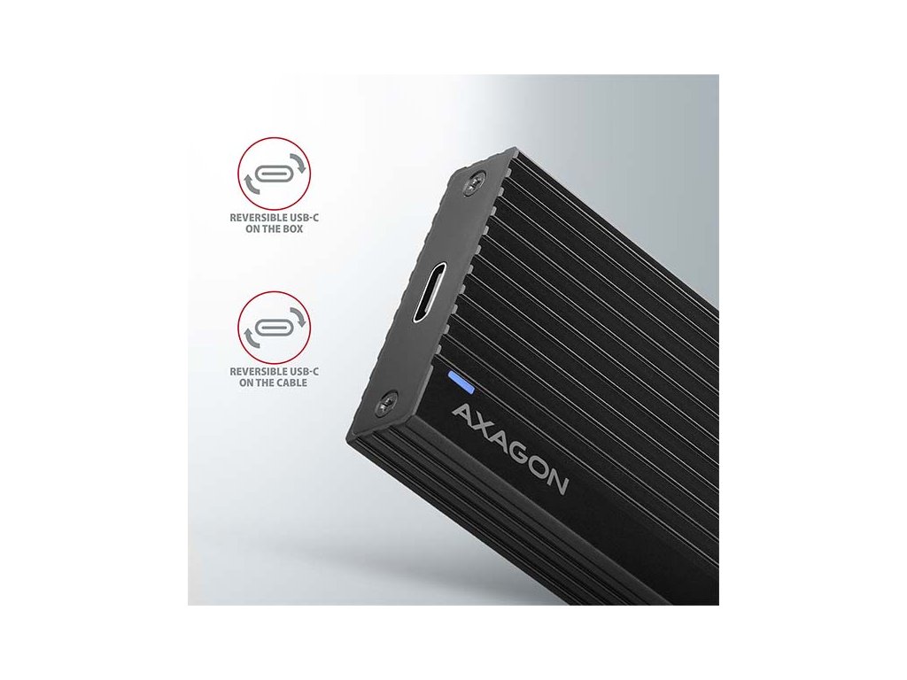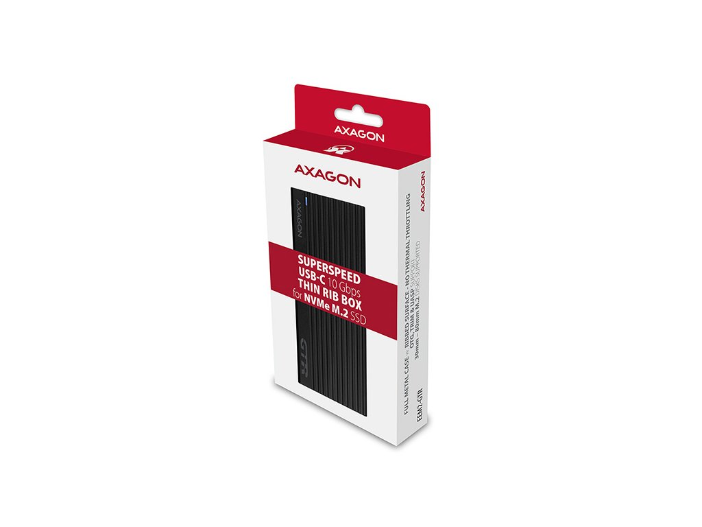 Super rychlý externí AXAGON EEM2-GTR THIN RIB box s USB 3.2 Gen 2 rozhraním je určen pro NVMe (PCI-Express) M.2 SSD disky. Spolehlivé připojení k počítači umožňuje oboustranný USB-C konektor na boxu spolu s dodávaným kabelem USB-C -> USB-C.Žebrovaný design těla boxu a teplovodivé podložky zajistí velice dobré chlazení vloženého M.2 SSD disku. Prodlužuje se tak jeho životnost a také je zamezeno zpomalování rychlosti disku tzv. „Thermal Throttling“. Robustní tělo boxu také zajistí dodatečnou ochranu disku.