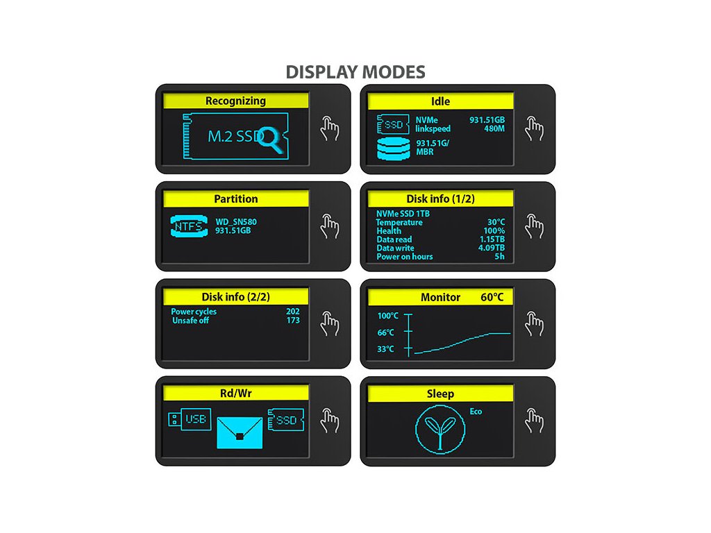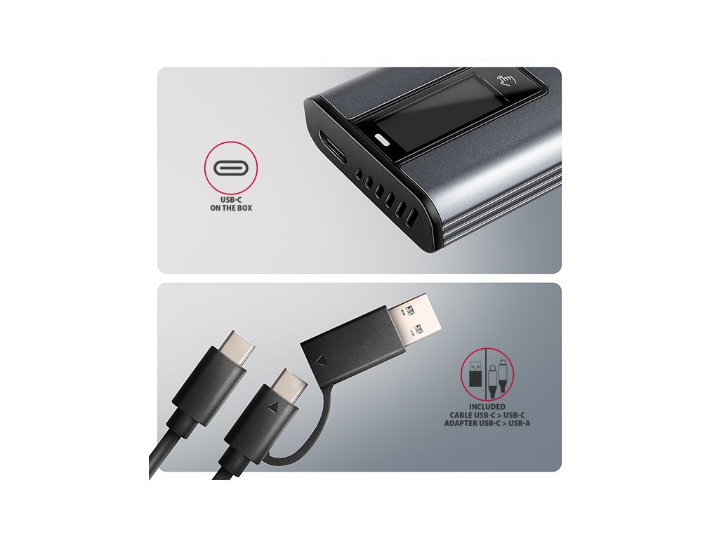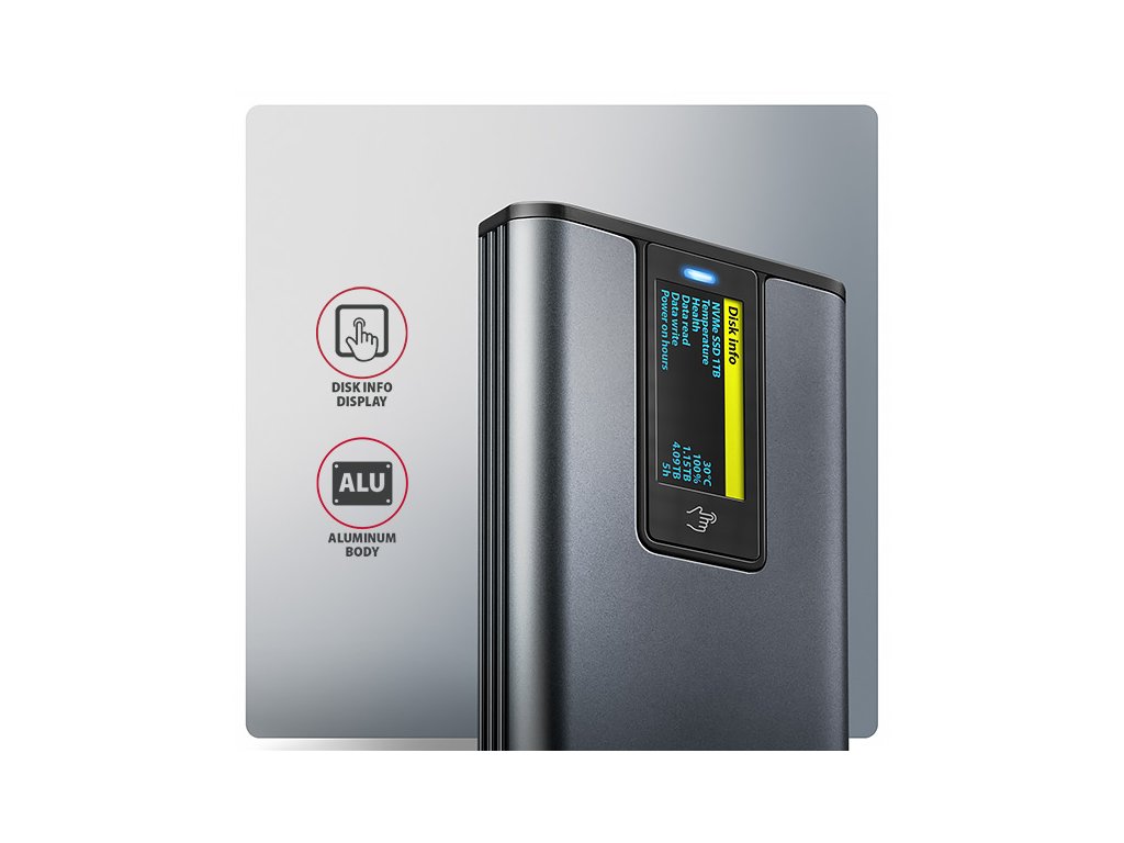 Externí AXAGON EEM2-SD2 DISPLAY box s USB 10Gbps rozhraním je určený pro M.2 NVMe nebo SATA SSD disky. Spolehlivé připojení k počítači umožňuje oboustranný USB-C konektor na boxu. V balení naleznete nejen kabel USB-C -> USB-C pro připojení boxu k počítači, ale také USB-C -> USB-A redukci. Můžete tak box připojit k jakémukoliv volnému USB portu na notebooku.Box je vybaven pokročilým LED displejem, který poskytuje okamžitý přehled o stavu vašeho disku. Nabízí několik režimů zobrazení, včetně detekce připojeného disku, použitého systémového souboru, teploty, zdraví disku, rychlosti přenosu dat a pracovních hodin. Detailní graf umožňuje sledování teploty disku v reálném čase, zatímco režim spánku šetří energii při nečinnosti. S tímto inteligentním monitoringem budete mít svůj disk vždy pod kontrolou - jednoduše, přehledně a efektivně.