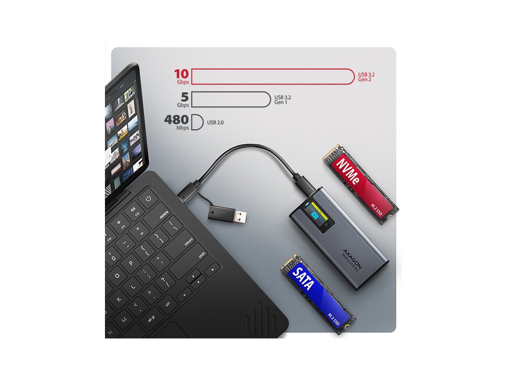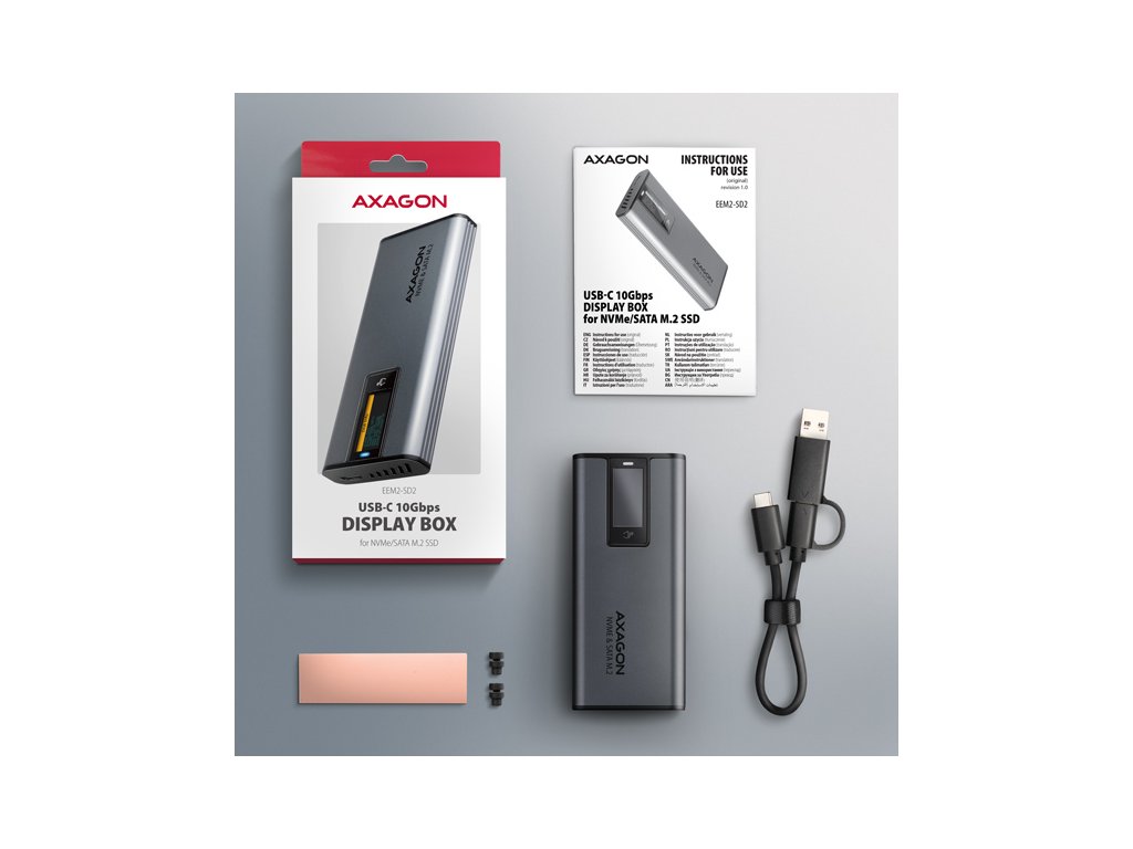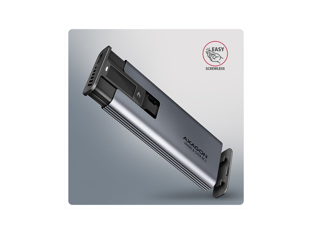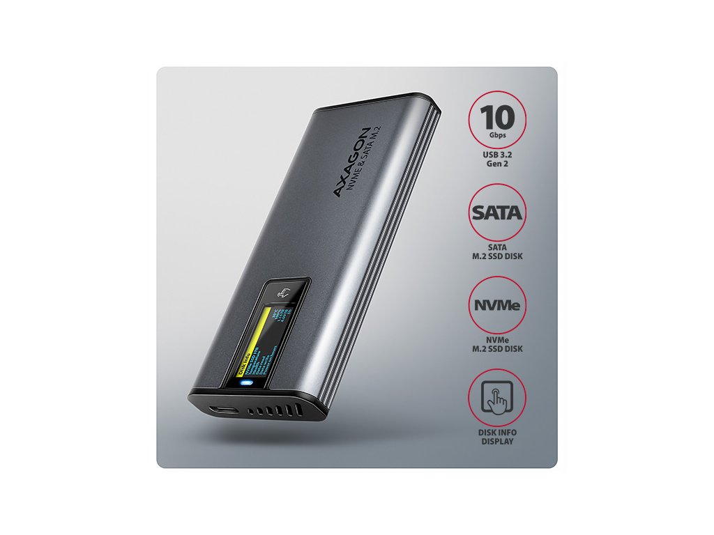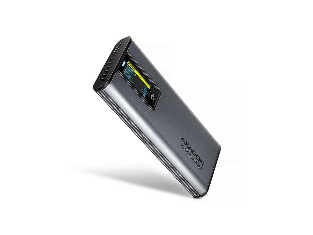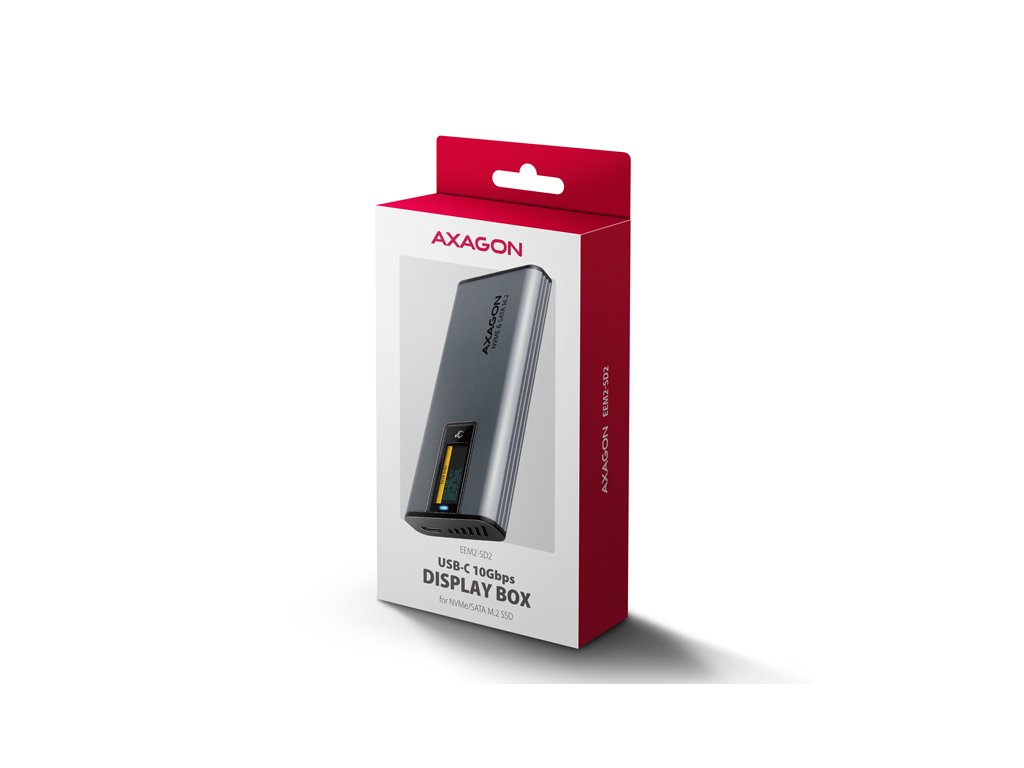 AXAGON EEM2-SD2 USB-C 10Gbps - M.2 NVMe & SATA SSD kovový DISPLAY box, bezšroubkový