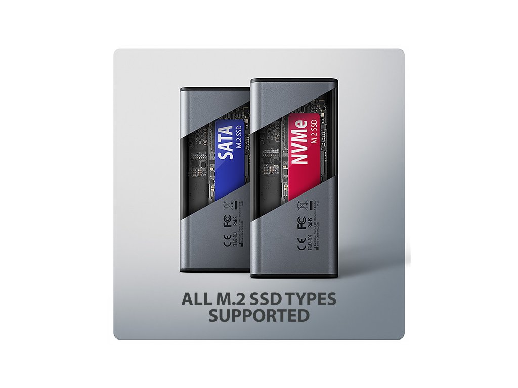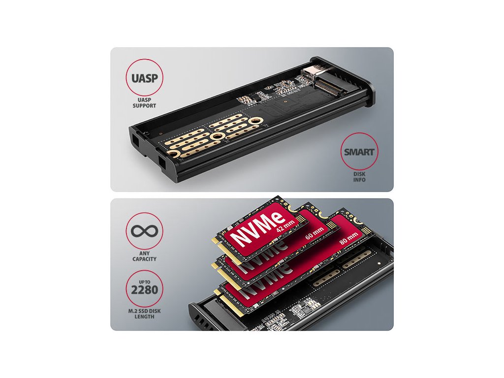Díky USB 3.2 Gen 2 rozhraní je přenosová rychlost až 10 Gb/s. Externí M.2 box podporuje i další moderní funkce např. UASP, TRIM a umožňuje čtení S.M.A.R.T. informací monitorujících stav disku. Unikátní vlastností, díky použitému čipsetu, je možnost použití jak M.2 NVMe tak i SATA disků. Nemusíte tak přemýšlet jaký typ M.2 disku do boxu vložíte. Box má možnost uchycení SSD karet ve třech různých délkách - 42, 60 a 80 mm. M.2 karty mohou být jednostranné i oboustranné, přičemž box neomezuje kapacitu vloženého SSD disku.