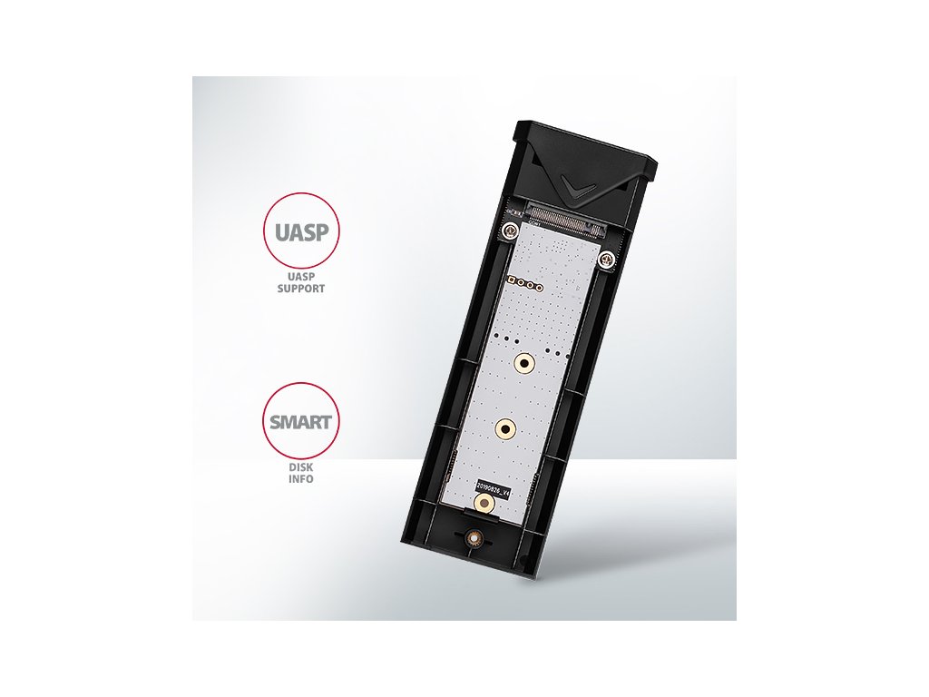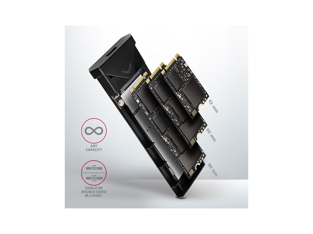 Výhodou je uchycení rovnou pro tři různé délky SSD disku - 42, 60 a 80 mm. M.2 disků mohou být jednostranné nebo oboustranné. Box nemá omezení kapacity vloženého SSD disku.