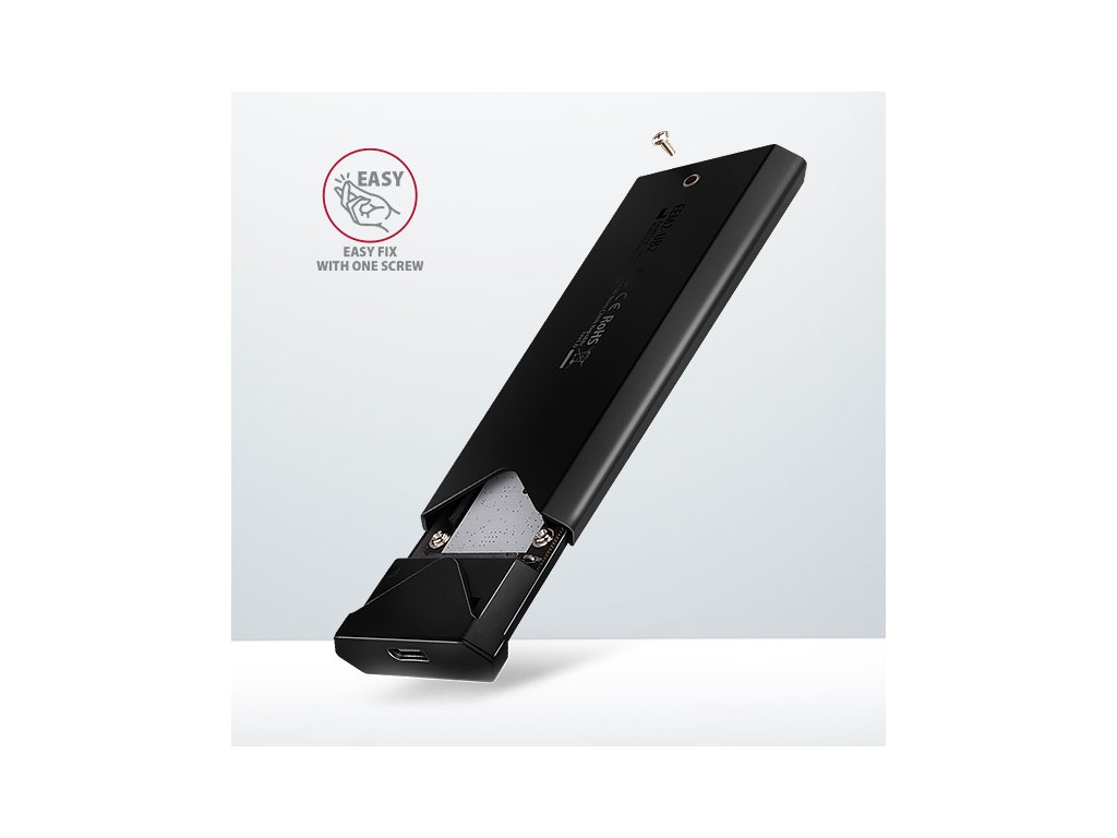 Otevírání boxu pouze přes jeden šroubek usnadňuje montáž i demontáž M.2 SSD disku. Výměna disků je rychlá a snadná a rozšiřuje tak možnosti využití boxu např. pro migraci dat, testování atd.