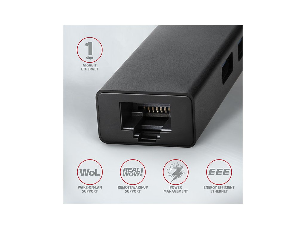 Štíhlý kovový USB 3.2 Gen 1 (USB 3.0) multi-port hub AXAGON HMA-GL3A nejen připojí k notebooku nebo počítači až tři USB zařízení současně, ale přidá také gigabitovou síťovou kartu, která připojí váš počítač k vysokorychlostní síti. Kovové tělo hubu je vyrobeno z hliníku a zajišťuje tak dokonalou mechanickou ochranu pro časté přenášení. Elegantní, jemně strukturovaný povrch brání nežádoucím otiskům. Napevno uchycený USB kabel délky 20 cm je ideální pro uživatele mobilních zařízení.Tento kompaktní multi portový hub také zvládne trvalé připojení několika externích disků. Díky rychlému USB 3.2 Gen 1 rozhraní je přenosová rychlost až 5Gb/s.