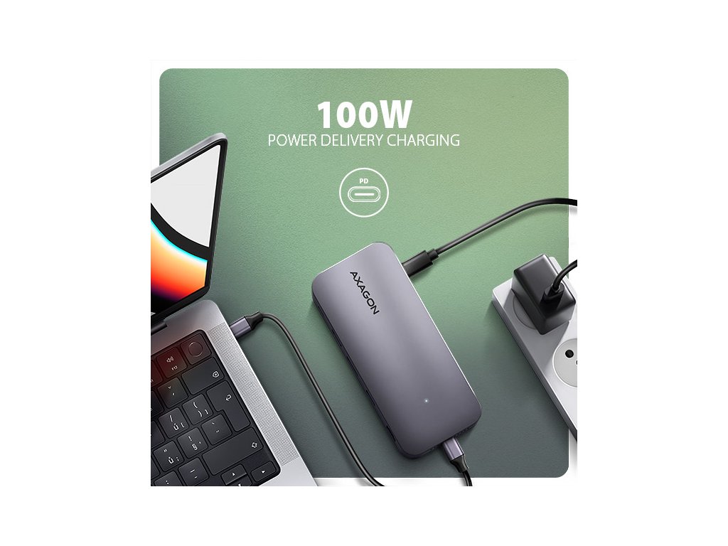 Druhý USB-C konektor je vyhrazen pouze pro nabíjení telefonů nebo notebooků pomocí technologie Power Delivery 3.0 výkonem až 100W. Do hubu zapojíte vhodnou USB-C Power Delivery nabíječku a hub připojíte k notebooku s podporou Power Delivery. Tím také uvolníte jeden USB-C port.