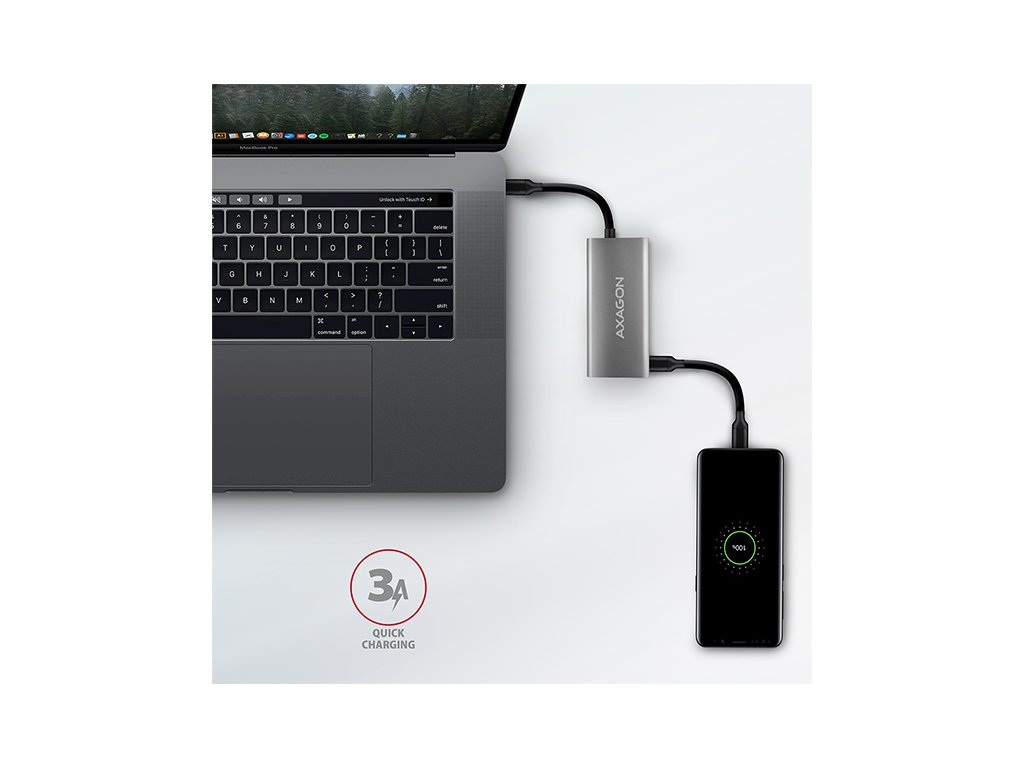 • Výkonné nabíjení mobilních zařízení proudem až 3A při 5V v USB-C portech hubu.