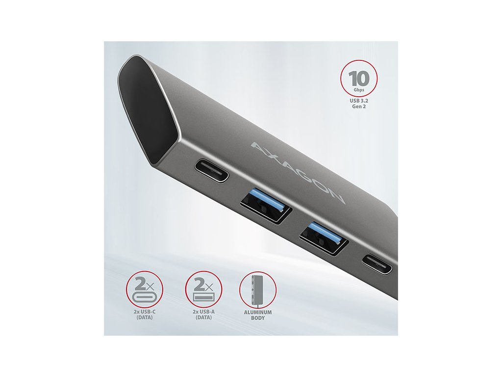 AXAGON HMC-4G2, USB-C 3.2 Gen 2 10 Gb/s hub, porty 2x USB-A + 2x USB-C, kabel USB-C 13cm
