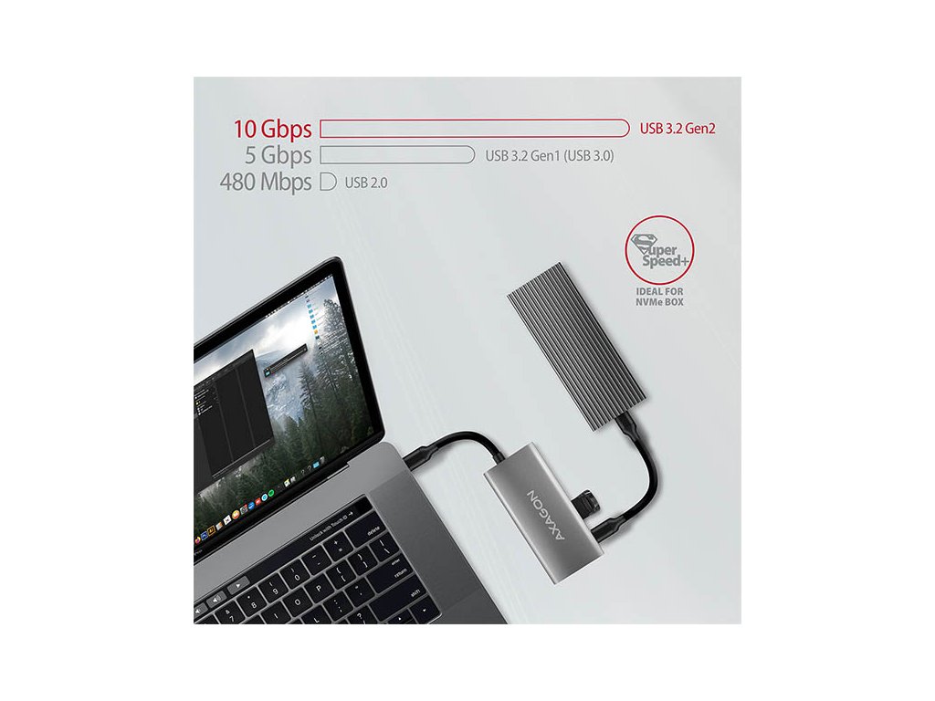 Díky pokročilému rozhraní USB 3.2 Generace 2 můžete ke všem výstupům připojit vysokorychlostní zařízení jako NVMe M.2 externí disky až 2x vyšší rychlostí 10 Gb/s oproti standardním hubům Generace 1 s rychlostí pouze 5 Gb/s. Hub zvládne trvalé připojení několika externích disků současně a USB-C porty dovolí nabíjení telefonů a tabletů proudem až 3A.