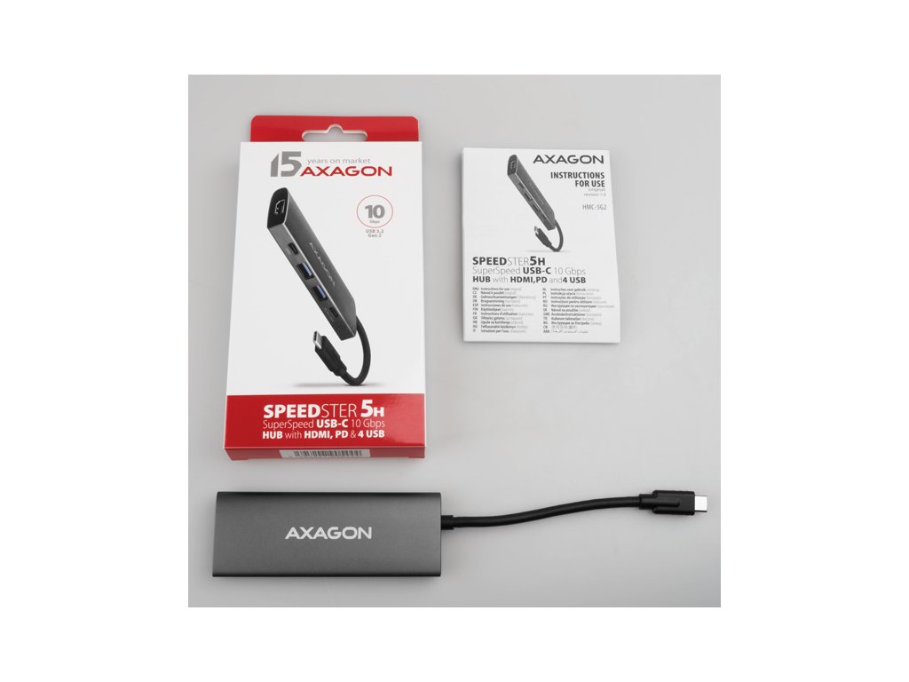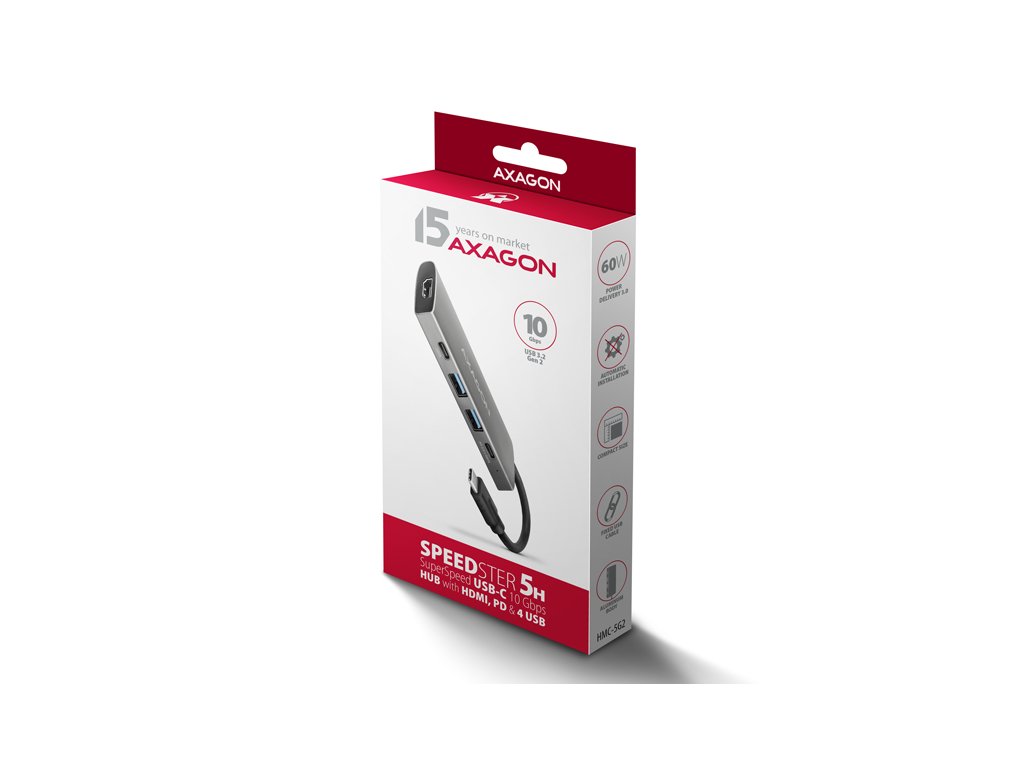 Multiportový USB-C 10Gbps AXAGON HMC-5G21 SPEEDSTER 5in1 hub rozšíří váš notebook, počítač nebo telefon o pětici portů. Připojení k zařízení probíhá prostřednictvím 13 cm USB-C kabelu. Okamžitě tak máte k dispozici připojení pro 4K monitor a další USB periferie. Zároveň získáte možnost napájení notebooku pomocí technologie Power Delivery. Kompatibilita s Thunderbolt 3/4/5 vám také poskytne jednoduchou a skladnou dokovací stanici k notebooku jako je například Apple MacBook Air nebo Pro.Dva USB-A 10Gbps výstupy umožňují připojení externích disků, flash disku, myši, tiskárny a dalšího USB příslušenství. USB porty také nabíjí mobilní telefony a tablety proudem až 1.5A. Hub je také vybaven kombinovaným USB-C portem, který může být použit pro přenos dat (USB 10Gbps), nebo pro nabíjení notebooku pomocí Power Delivery nabíječky. S využitím vhodné PD nabíječky tak napájíte nejen notebook, ale i samotný hub, s výkonem až 60W díky technologii Power Delivery 3.0.