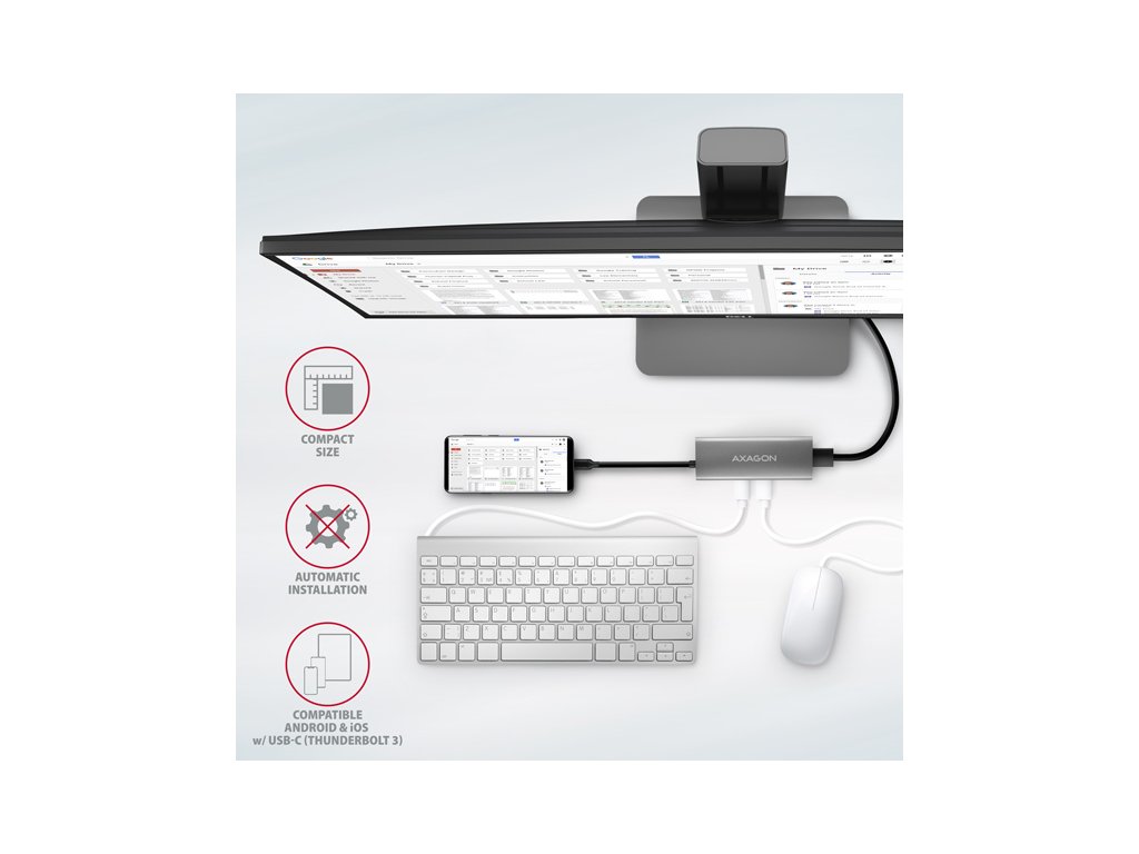 USB-C hub je ideálním doplňkem pro notebooky bez USB-A konektorů a video výstupu. Lze tak využít Vaše stávající USB periferie bez nutnosti pořizování nových. Díky funkcím Plug and Play a Hot Plug je samotné zapojení hubu velmi jednoduché bez složité instalace, a také lze jednoduše připojovat a odpojovat periferie za běhu počítače. Rozbočovač se nezalekne ani připojení k telefonům s USB-C konektorem. K telefonu tak připojíte například flash disk, klávesnici, myš, monitor, TV nebo projektor.