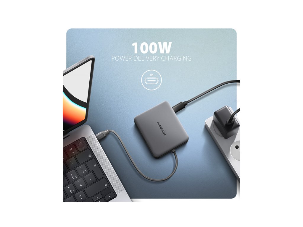 USB-C konektor je vyhrazen pouze pro napájení a současné dobíjení notebooků pomocí technologie Power Delivery 3.0 výkonem až 100W. Do hubu zapojíte USB-C Power Delivery nabíječku a hub připojíte k notebooku. Tím také uvolníte jeden USB-C port. Podmínkou je notebook s podporou nabíjení z USB-C portu pomocí Power Delivery a vhodná PD nabíječka.