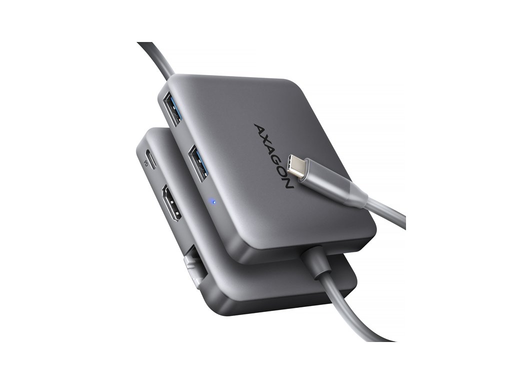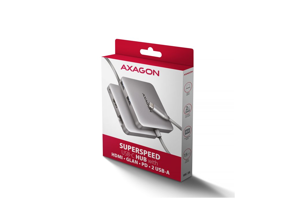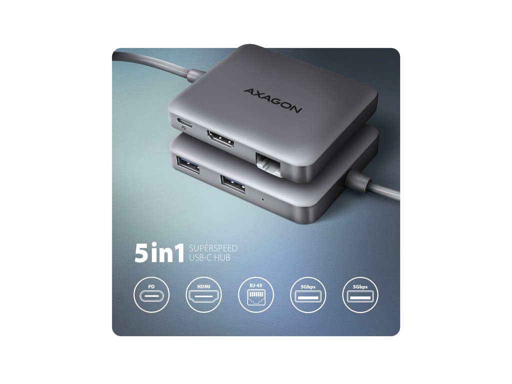 AXAGON HMC-5HL, USB 5Gbps hub, 2x USB-A, HDMI 4k/60Hz, RJ-45 GLAN, PD 100W, kabel USB-C 20cm