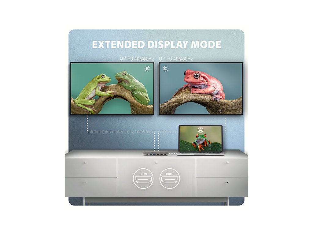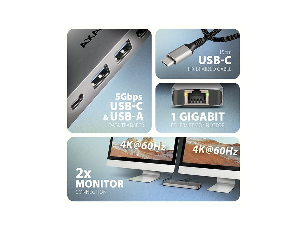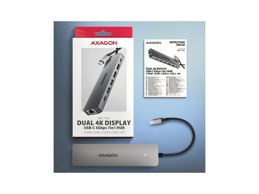 Multiportový USB-C 5Gbps AXAGON HMC-7HX2 DUAL 4K DISPLAY 7in1 hub rozšíří váš notebook, počítač nebo telefon o sedm portů. Váš notebook připojíte k hubu přes 15 cm dlouhý USB-C kabel. Okamžitě tak máte k dispozici připojení pro dva 4K monitory, tři USB zařízení a konektor RJ-45 pro Gigabitovou ethernet síť. Zároveň získáte možnost napájení notebooku pomocí technologie Power Delivery. Replikátor portů vám poskytne jednoduchou a skladnou dokovací stanici 7v1 pro moderní notebooky.USB rozbočovač nabízí tři USB 5Gbps výstupy, dva se standardním USB-A a třetí s USB-C datovým konektorem. Díky USB 3.2 Gen 1 rozhraní je přenosová rychlost hubu až 5Gb/s. Hub zvládne trvalé připojení několika externích disků současně a také dovolí nabíjení telefonů a tabletů proudem až 1.5A/5V. Z hubu tak snadno nabijete např. Android smartphone, Apple iPhone, Apple iPad apod.