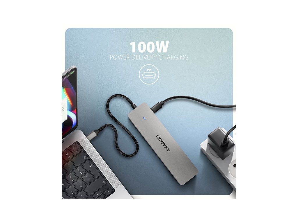 Další z USB-C konektorů je vyhrazen pouze pro nabíjení telefonů nebo notebooků pomocí technologie Power Delivery 3.0 výkonem až 100W. Do hubu zapojíte vhodnou USB-C Power Delivery nabíječku a hub připojíte k notebooku s podporou Power Delivery. Tím také uvolníte jeden USB-C port.