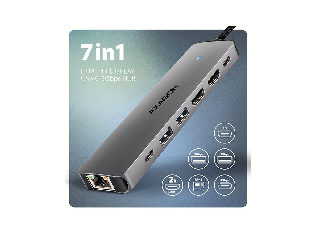 AXAGON HMC-7HX2, USB 5Gbps hub, 2x USB-A, USB-C, 2x HDMI 4k/60Hz, RJ-45 GLAN, PD 100W, kabel 15cm
