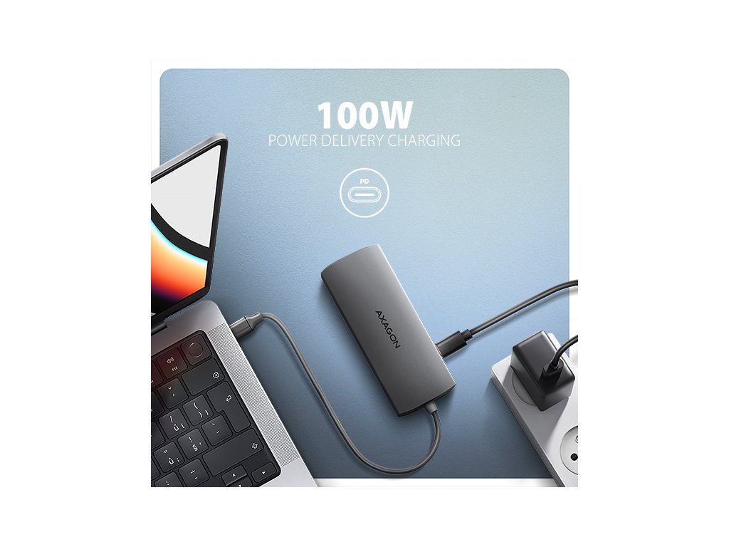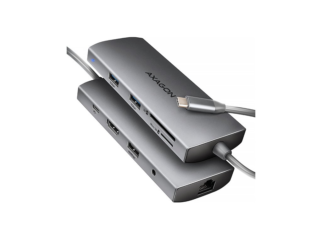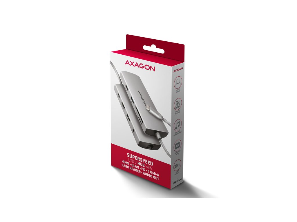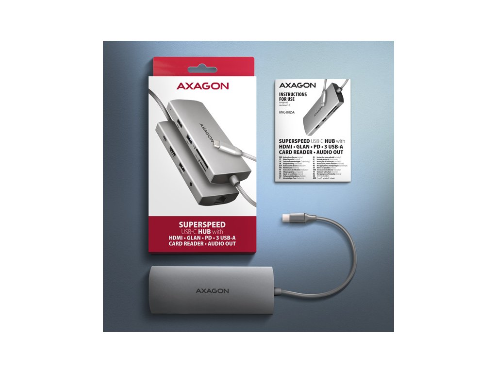 AXAGON HMC-8HLSA, USB 5Gbps hub, 3x USB-A, HDMI 4k/60Hz, RJ-45 GLAN, SD/microSD, audio, PD 100W