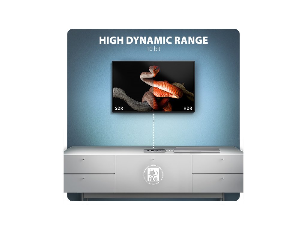 Díky podpoře HDR (vysoce dynamický rozsah) si můžete bez omezení vychutnat výrazně rozšířený rozsah barev a kontrastů. Pro správné fungování video výstupu je nutné, aby notebook měl USB-C port s podporou DisplayPort Alternate Mode (DP Alt Mode) nebo port Thunderbolt 3, 4 a výše.