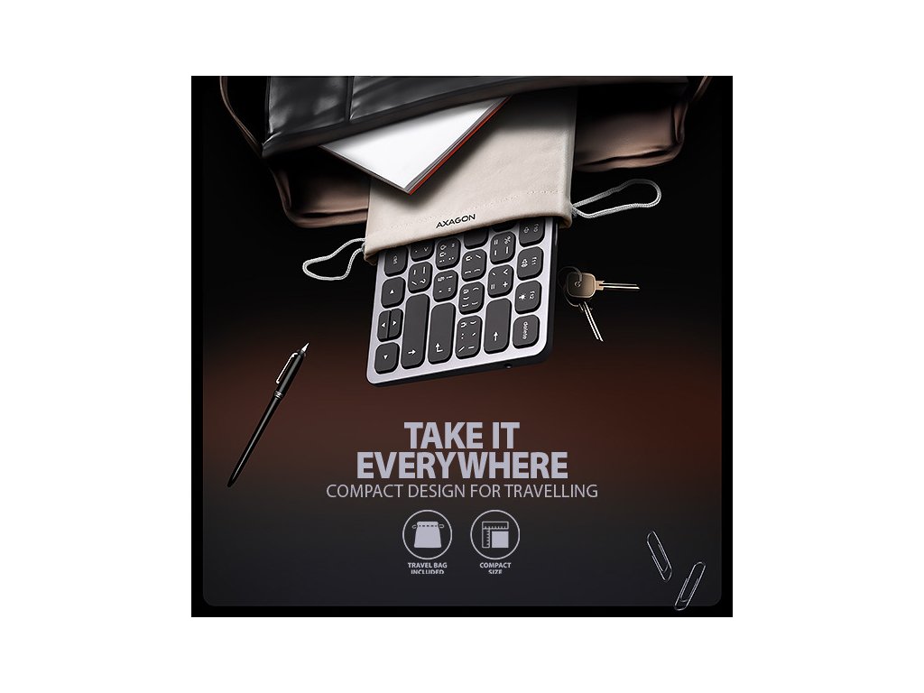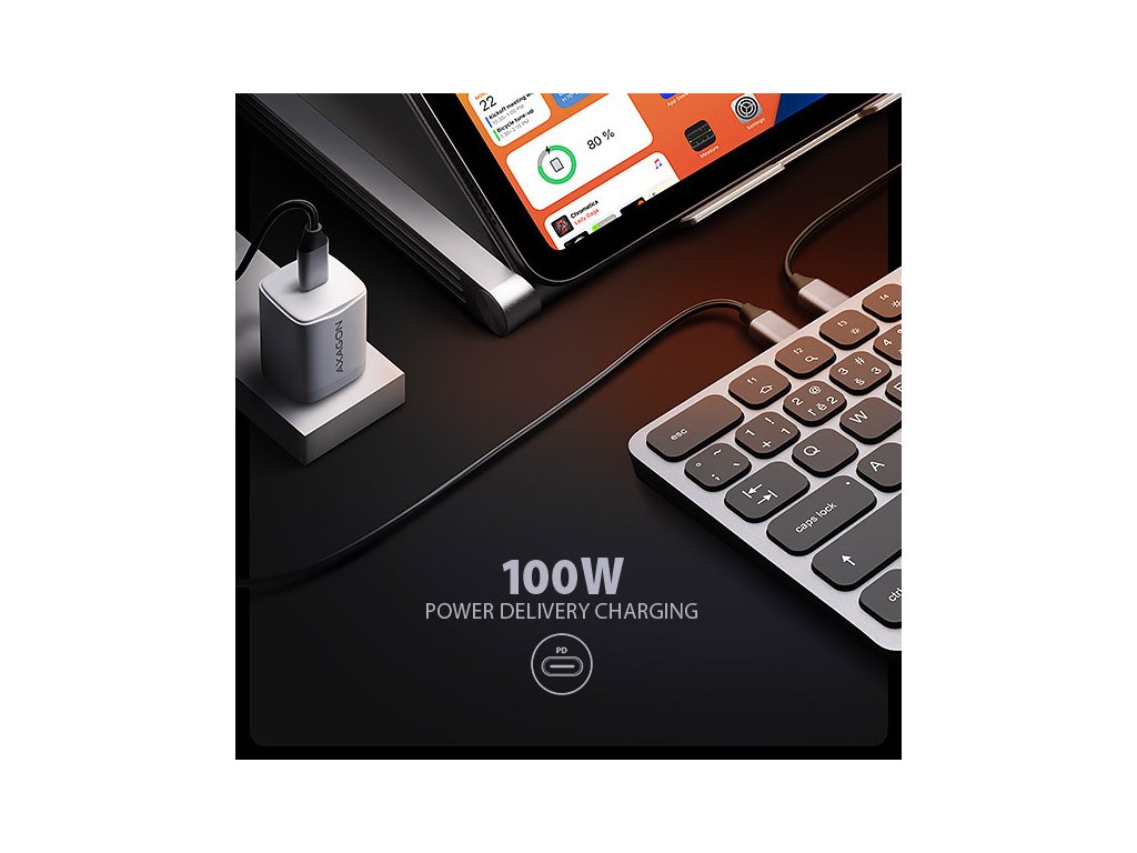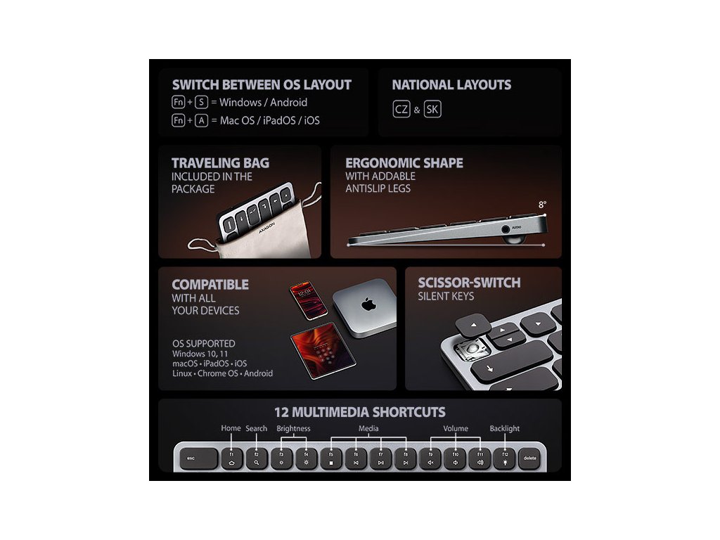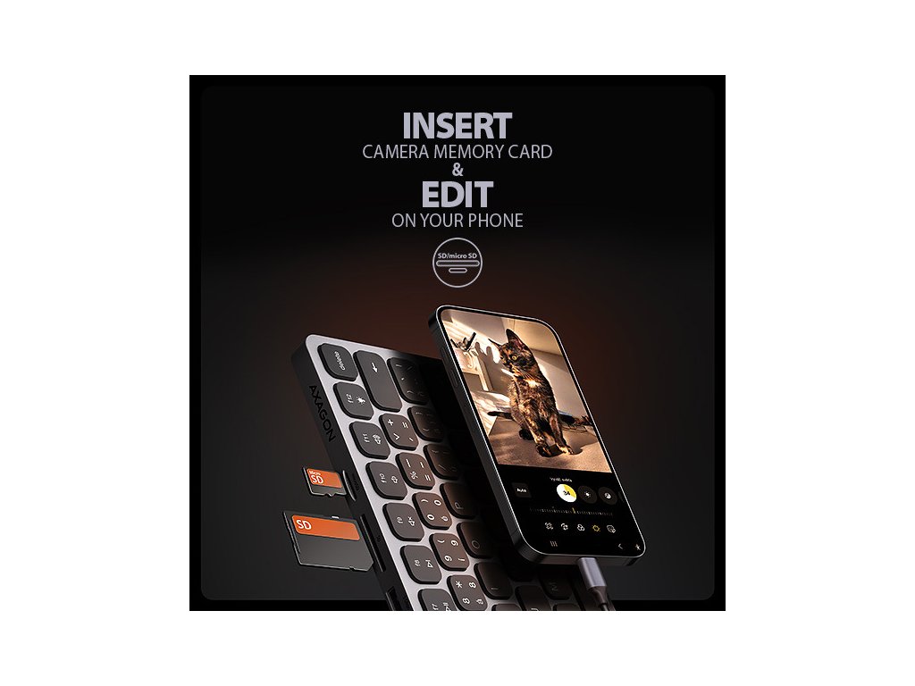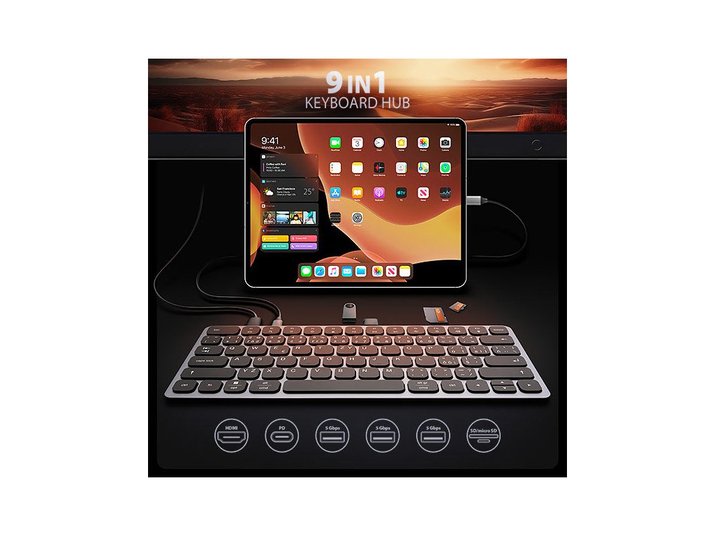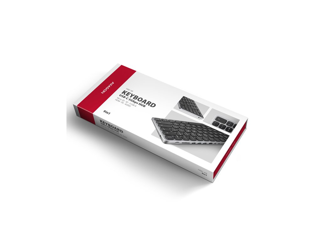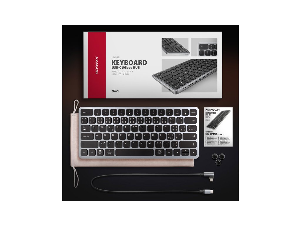 AXAGON HMC-KB-CS KEYBOARD hub promění Váš telefon, tablet nebo mini notebook na plnohodnotné počítačové pracoviště. Vaše mobilní zařízení připojíte k dokovací stanici 9in1 přes dodaný 60 cm dlouhý kabel. V okamžiku tak máte k dispozici integrovanou klávesnici, čtečku SD i microSD karet a konektory pro připojení externího monitoru, tří USB zařízení, sluchátek nebo headsetu a Power Delivery napájení. Je však nutné, aby USB-C port vašeho mobilního zařízení podporoval video výstup (DisplayPort Alternate Mode) a Power Delivery napájení.Klávesnice, vestavěná v elegantním hliníkovém těle hubu, je osazena chiclet klávesami s nůžkovým mechanismem a 2 mm zdvihem pro přesné a tiché psaní. Klávesnice nabízí nastavitelné podsvícení v 5 úrovních, 12 multimediálních kláves a možnost zvětšení sklonu pro pohodlné a ergonomické užívání. Samozřejmostí je potisk kláves s česko - slovenskou lokalizací.