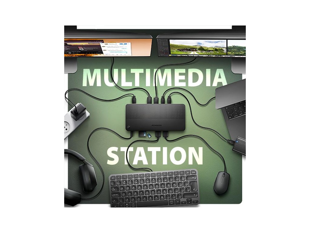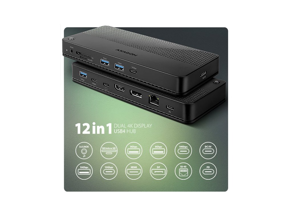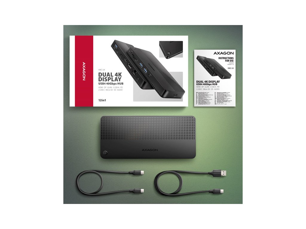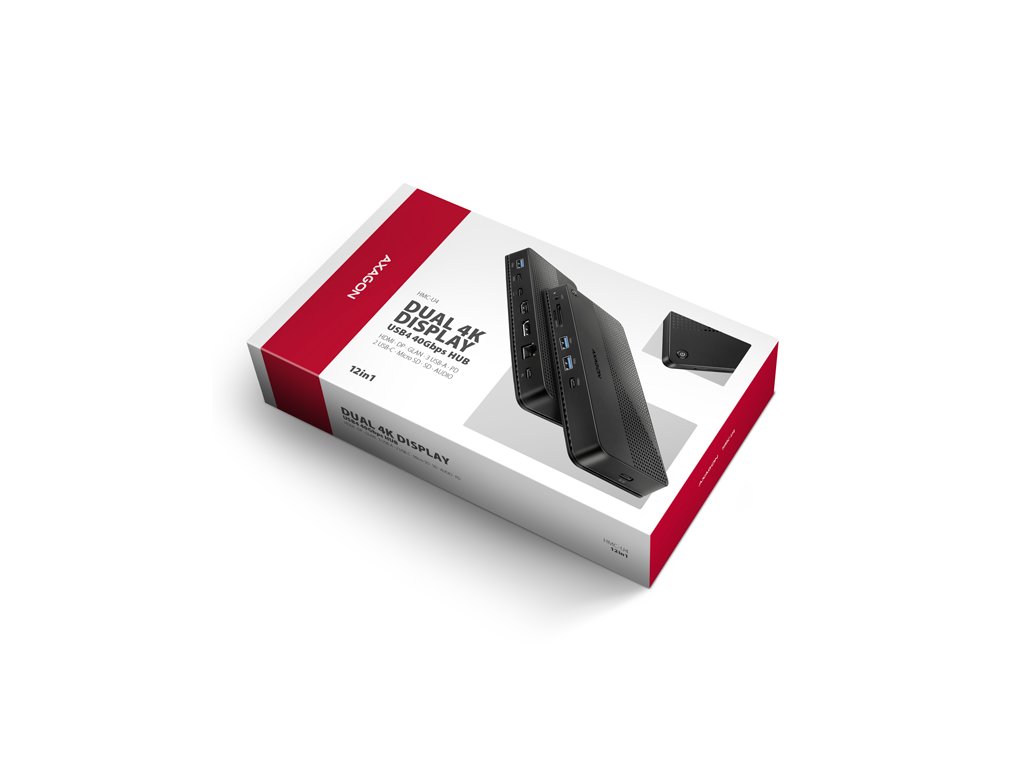 AXAGON HMC-U4 DUAL 4K DISPLAY dock promění Váš notebook, tablet nebo telefon na multimediální centrum. Díky nejmodernější technologii USB4 nabízí tato dokovací stanice celkovou datovou propustnost až 40 Gbps. Můžete tak plně využít i to nejnáročnější počítačové příslušenství a užít si špičkový zážitek. Ať už sledujete video v 8K rozlišení, nebo pracujete se dvěma 4K monitory současně, tato technologie vám zajistí potřebný výkon. USB4 nabízí výhodu kompatibility s technologií Thunderbolt a zároveň podporuje zpětnou kompatibilitu s předchozími generacemi USB.Notebook připojíte k dokovací stanici 12in1 přes dodaný 80 cm dlouhý kabel. V okamžiku tak máte k dispozici rychlou čtečku SD i microSD karet a konektory pro připojení dvou externích monitorů, pětici USB zařízení, sluchátek nebo headsetu a Power Delivery napájení. Je však nutné, aby USB-C port vašeho zařízení podporoval video výstup (DisplayPort Alternate Mode) a Power Delivery napájení.