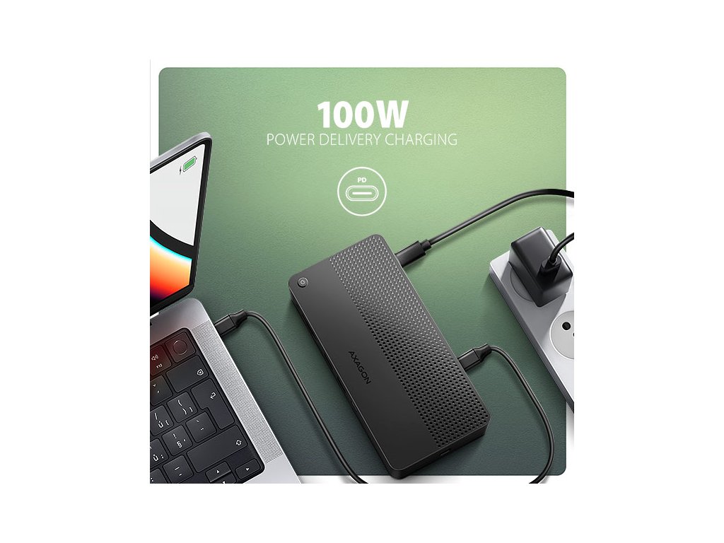 USB-C vstup (PD) je určen pro Power Delivery nabíječku. Díky tomu je jak notebook, tak i dock, napájen přímo z PD nabíječky s využitím technologie Power Delivery 3.0 s výkonem až do 100W. S přídavným napájením přes USB-C vstup (DC 5V) můžete posílit napájení, při provozu bez připojené PD nabíječky a k multiportovému hubu připojit i zařízení s vyšší spotřebou energie například více externích disků.
