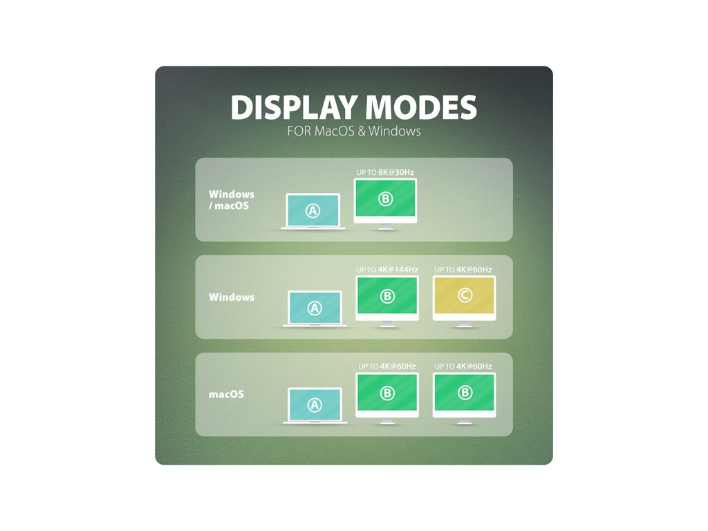 • Pro dosažení maximálních hodnot rozlišení a frekvencí na video výstupech je nutné dock zapojit do USB-C portu s podporou DisplayPort Alternate Mode (DP Alt Mode) verze min. 1.4 nebo do USB-C portu s podporou min. Thunderbolt 4. Dále je nutný vhodný aktualizovaný OS a aktuální grafické ovladače.