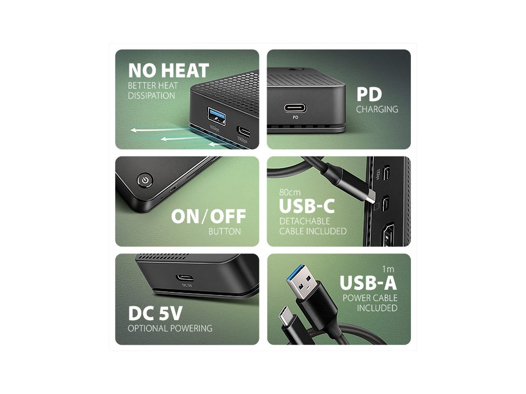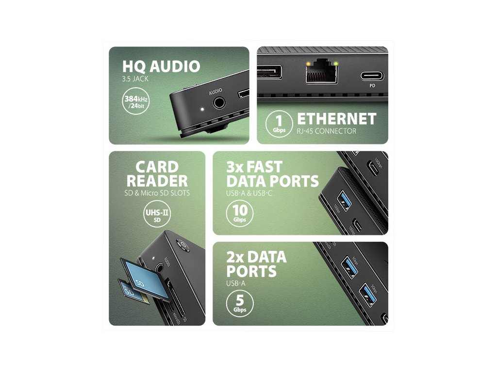 Dokovací stanice disponuje třemi 10Gbps výstupy USB-C a USB-A a dvěma 5Gbps výstupy USB-A. Tato pětice USB portů umožňuje připojení externích disků, flash disků, myši, tiskárny a dalšího USB příslušenství. USB porty také nabíjí mobilní telefony a tablety výkonem až 7.5W.