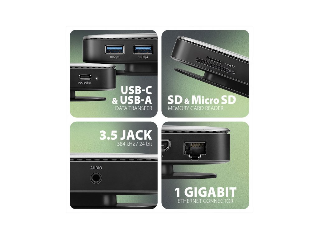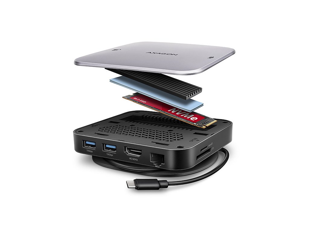 AXAGON HMC-UFO, USB 10Gbps hub, 2x USB-A, USB-C, HDMI 4k/60, RJ-45, M.2 slot, SD/mSD, audio, PD