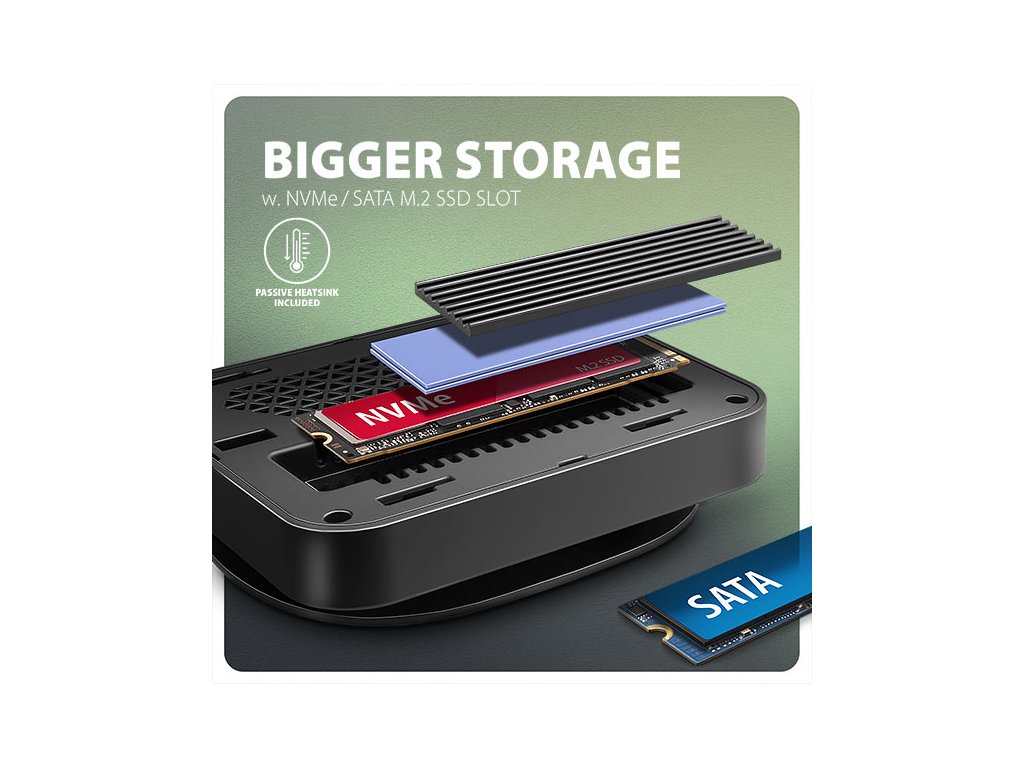 NVME nebo SATA M.2 SSD disk připojíte díky vestavěnému slotu na vrchní straně hubu. Multiport hub se tímto stává i externím diskem. Karty M.2 mohou být jednostranné nebo oboustranné o rozměrech 22x42, 22x60 a 22x80 mm. Externí M.2 úložiště nemá omezení kapacity SSD disků, podporuje funkce TRIM a UASP a umožňuje čtení S.M.A.R.T. informací monitorujících stav disku.