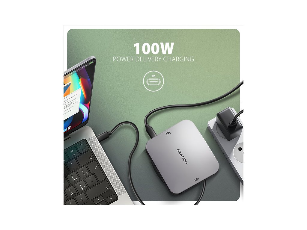 Dva USB-A 10Gbps výstupy umožňují připojení externích disků, flash disku, myši, tiskárny a dalšího USB příslušenství. USB porty také nabíjí mobilní telefony a tablety výkonem až 7.5W. Hub je také vybaven kombinovaným USB-C portem, který může být použit pro přenos dat (USB 5Gbps), nebo pro nabíjení notebooku pomocí Power Delivery nabíječky. S využitím vhodné PD nabíječky tak napájíte nejen notebook, ale i samotný hub, s výkonem až 100W díky technologii Power Delivery 3.0.