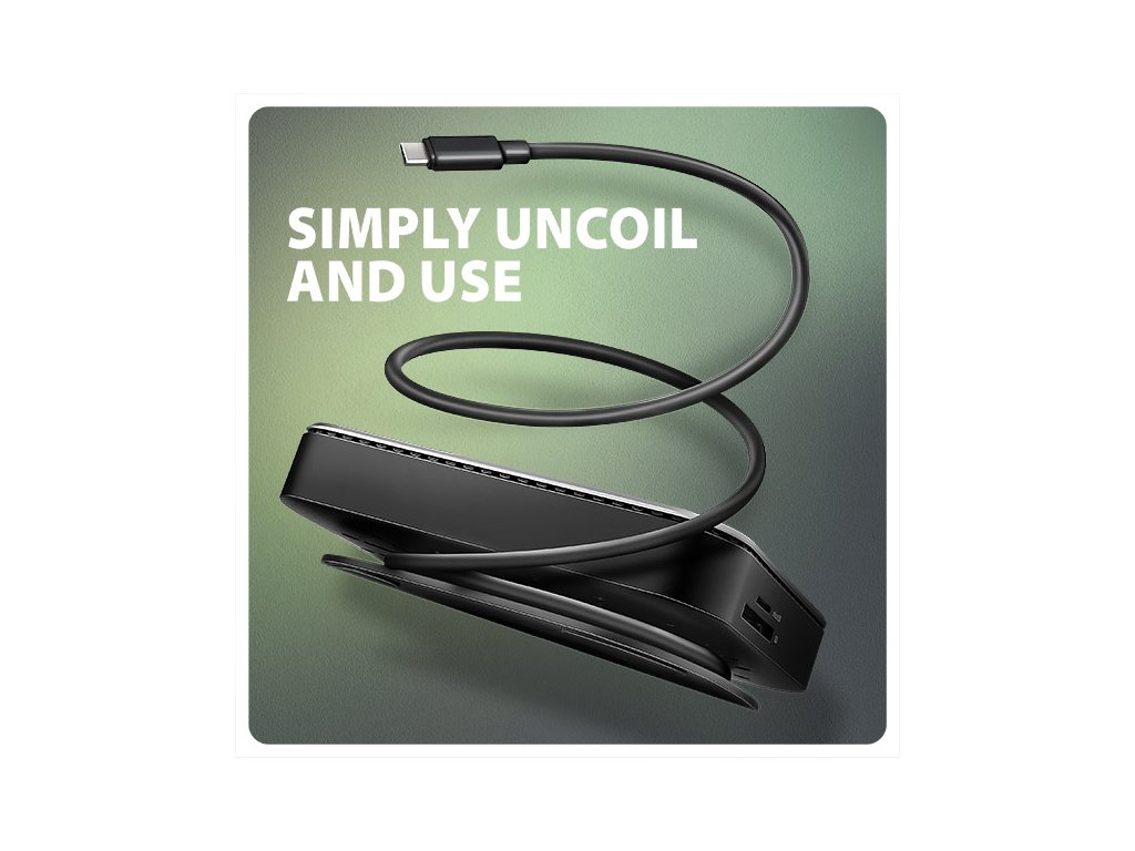 Díky promyšlenému designu se čtyřmi gumovými podložkami na podstavci zůstane stanice pevně na svém místě. Jednou z nejpraktičtějších funkcí je uchycení USB-C kabelu, který je elegantně omotaný kolem podstavce. Díky tomuto řešení si můžete snadno odvinout přesně takovou délku kabelu, jakou aktuálně potřebujete, což zamezuje tomu, aby vám přebytečný kabel zbytečně zabíral místo na stole.