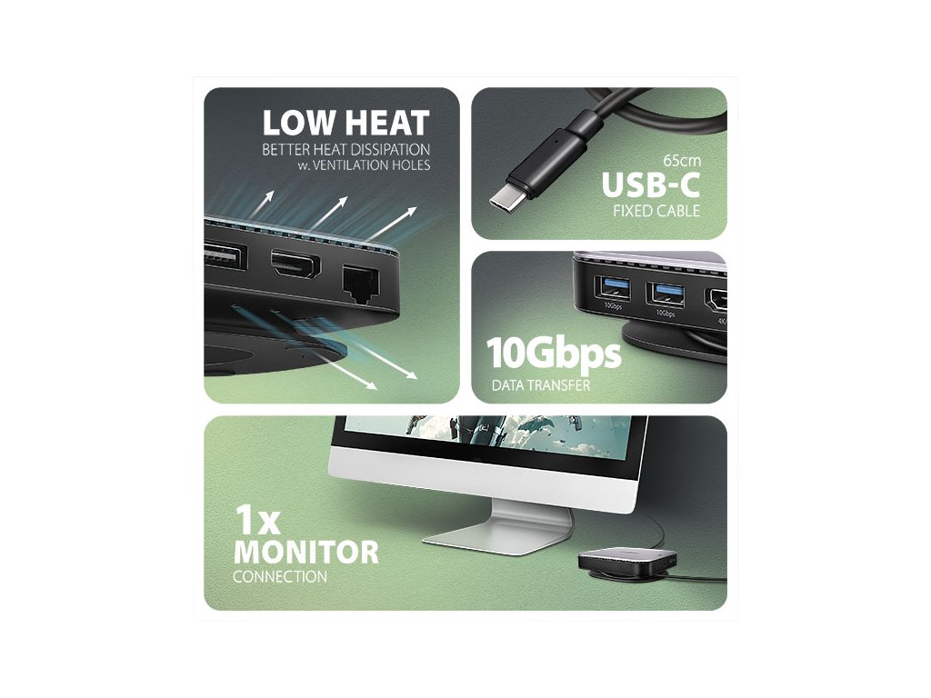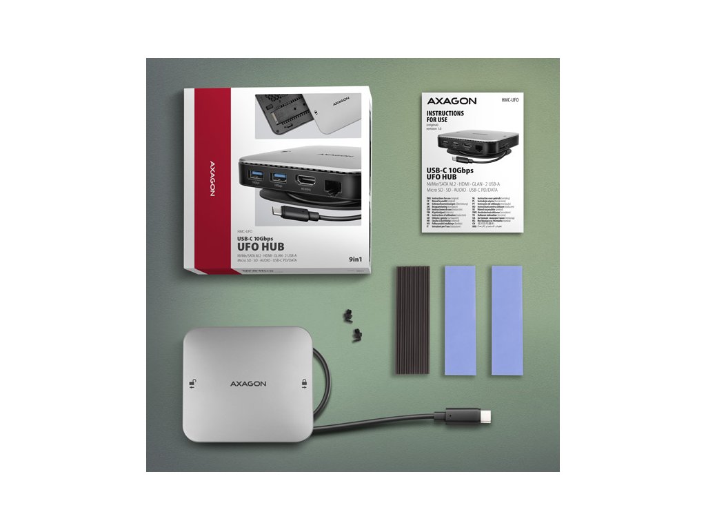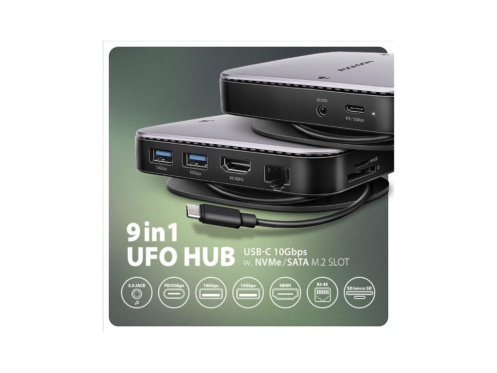 AXAGON HMC-UFO USB-C 10Gbps UFO hub rozšíří Váš notebook, počítač nebo tablet o osm portů a externí box pro M.2 disk. Váš notebook připojíte k dokovací stanici 9in1 přes USB-C 65 cm dlouhý kabel. V okamžiku tak máte k dispozici integrovaný slot pro NVMe nebo SATA M.2 disk, čtečku SD i microSD karet a konektory pro připojení monitoru, USB zařízení, sluchátek, síťového kabelu a Power Delivery napájení. Kompatibilita s Thunderbolt 3/4 vám také poskytne jednoduchou a skladnou dokovací stanici k notebooku jako je například Apple MacBook Air nebo Pro.Pro správnou funkci hubu je nutné, aby USB-C port vašeho notebooku podporoval video výstup (DisplayPort Alternate Mode nebo Thunderbolt 3 a vyšší) a Power Delivery napájení.