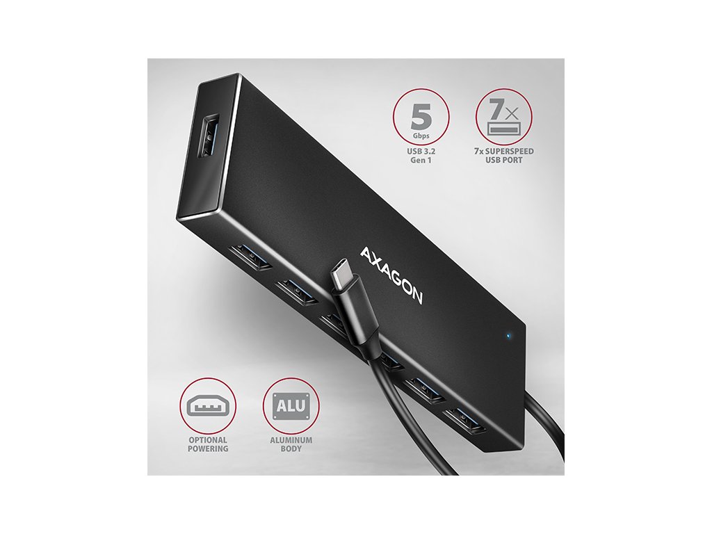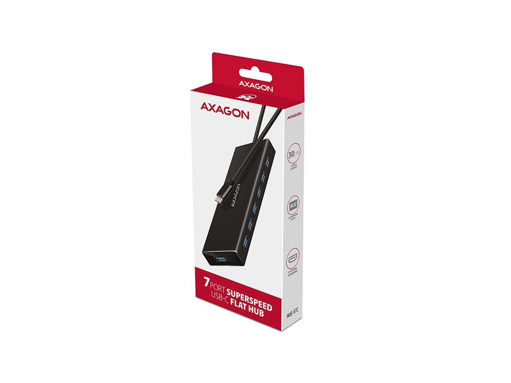 AXAGON HUE-F7C, 7x USB 3.2 Gen 1 ALU FLAT CHARGING hub, micro USB nap. konektor, kabel USB-C 30cm