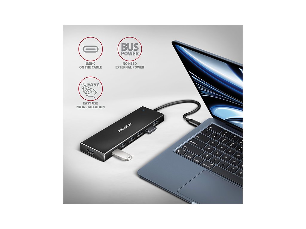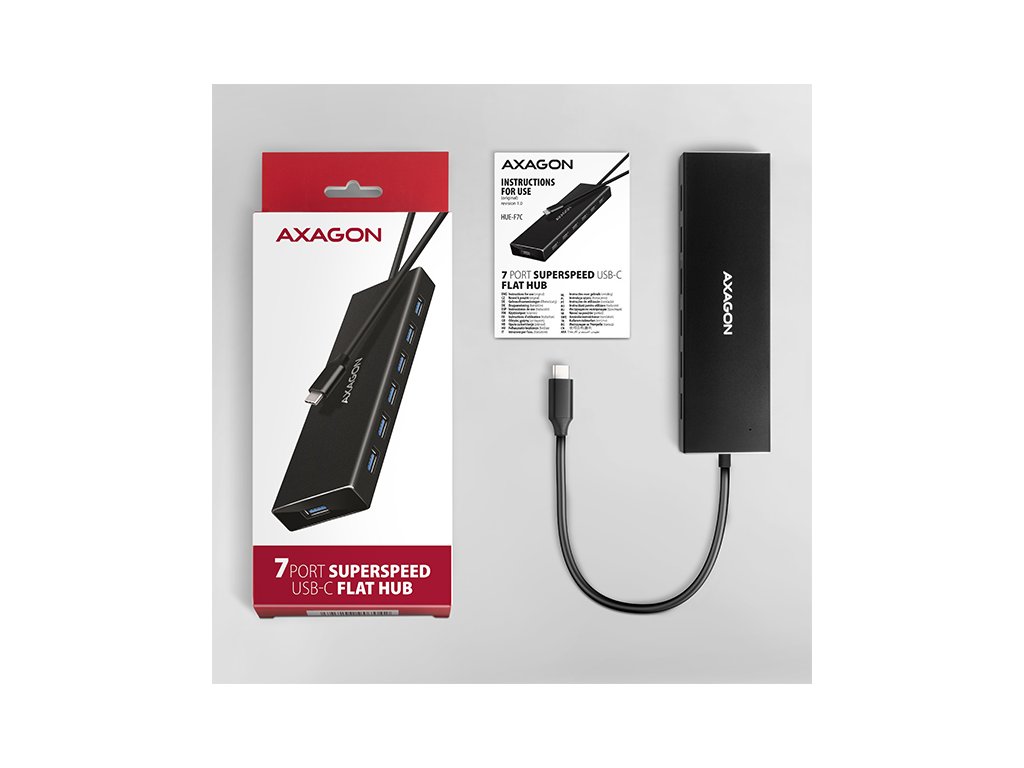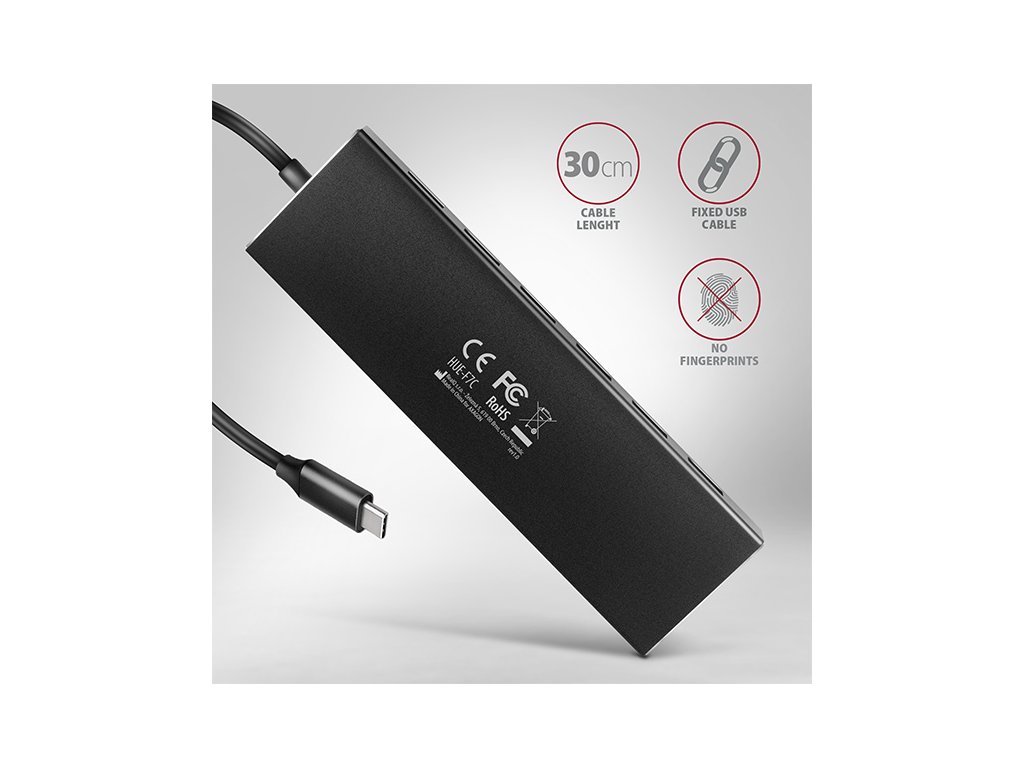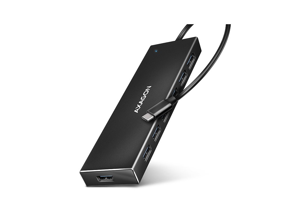 Tenký USB-C 3.2 Gen 1 (USB 3.0) hub AXAGON HUE-F7C s USB kabelem dlouhým 1.2m snadno a rychle připojí k notebooku až sedm USB zařízení současně. Standard USB 3.2 Gen 1 umožní přenosovou rychlost až 5Gb/s.Kovové tělo hubu je vyrobeno z hliníku a zajišťuje tak jeho dokonalou mechanickou ochranu. Elegantní, jemně strukturovaný povrch brání nežádoucím otiskům. Napevno uchycený USB-C kabel délky 30 cm je ideální pro uživatele mobilních zařízení. Výhodou je samostatný USB-A port vpředu, který poslouží pro připojení objemnějších flash disků, čteček a dalších USB zařízení.