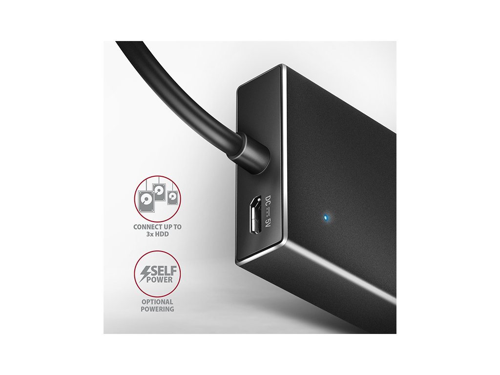 Všestrannost tohoto USB hubu zvyšuje vestavěný micro USB konektor pro dodatečné napájení ze standardních USB nabíječek dodávaných k mobilním telefonům. Díky tomuto přídavnému napájení lze například připojit ještě více externích disků k počítači nebo zvýšit počet nabíjených mobilních telefonů. Zvládne trvalé připojení několika externích disků i bez externího napájení hubu. Po připojení externího napájení lze pracovat i s pěti externími disky současně.
