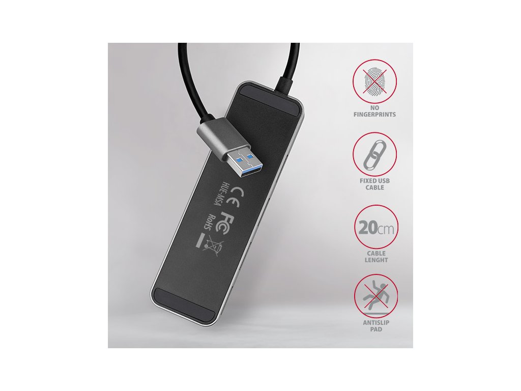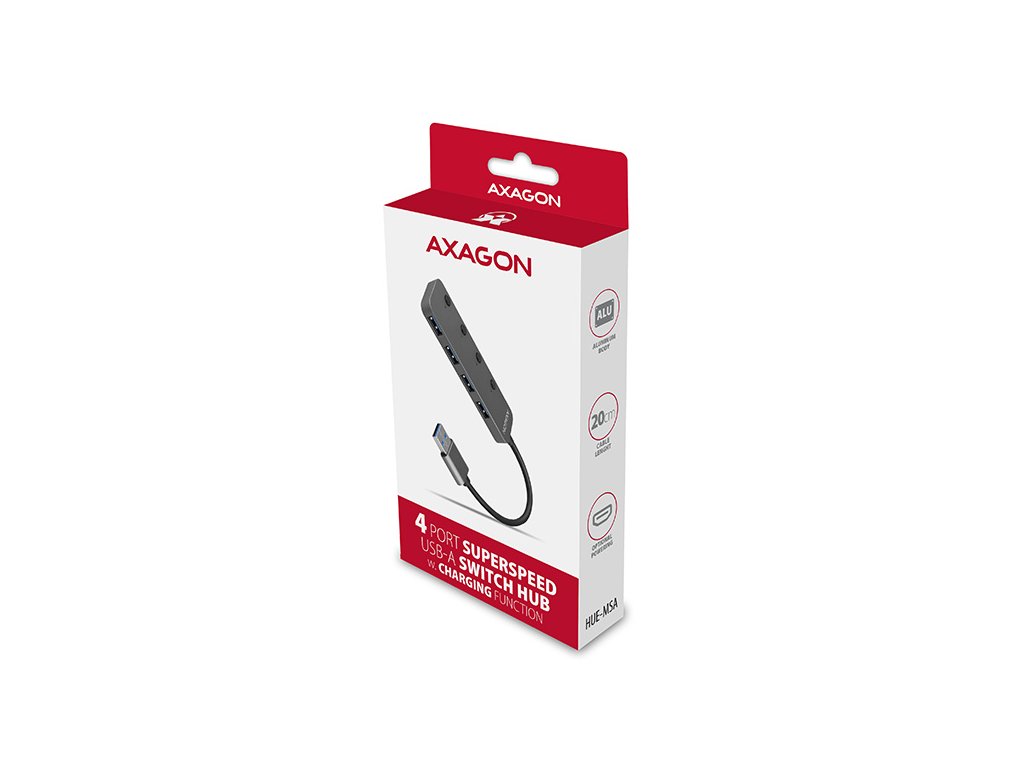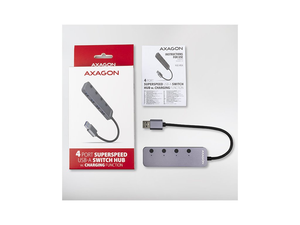 AXAGON HUE-MSA, 4x USB 3.2 Gen 1 SWITCH hub, kovový, micro USB nap. konektor, kabel USB-A 20cm