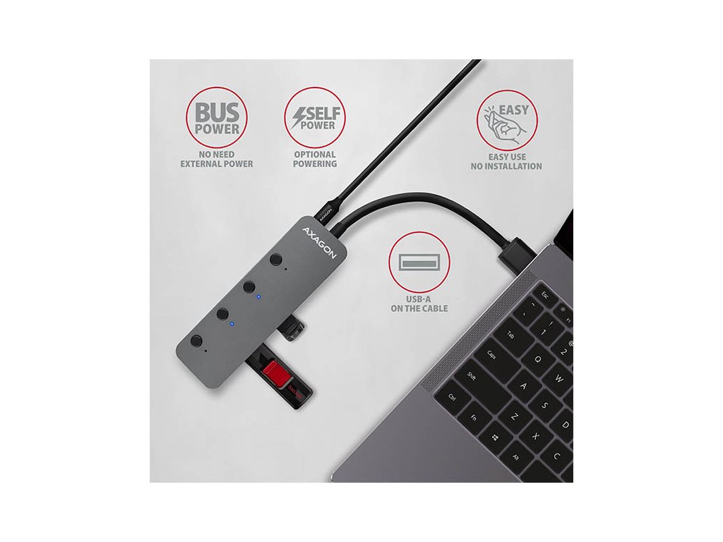 Kovový USB 3.2 Gen 1 (USB 3.0) hub AXAGON HUE-MSA nejen připojí k notebooku nebo počítači až čtyři USB zařízení současně, ale nabízí též vypínání USB portů a funkci Charging hub. Kovové tělo hubu je vyrobeno z hliníku a zajišťuje tak dokonalou mechanickou ochranu pro časté přenášení. Elegantní, jemně strukturovaný povrch brání nežádoucím otiskům. Gumové nožky zabraňují klouzání hubu po stole. Napevno uchycený USB kabel délky 20 cm je ideální pro uživatele mobilních zařízení.Každý USB port lze vypnout / zapnout pomocí tlačítka. Lze tak snadno odpojovat nepotřebná zařízení bez nutnosti jejich odpojování z USB hubu. Každý USB-A port má modrou LED indikaci zapnutí / vypnutí portu. Po zapojení hubu všechny LED svítí = porty jsou zapnuté, LED nesvítí = port je vypnutý.