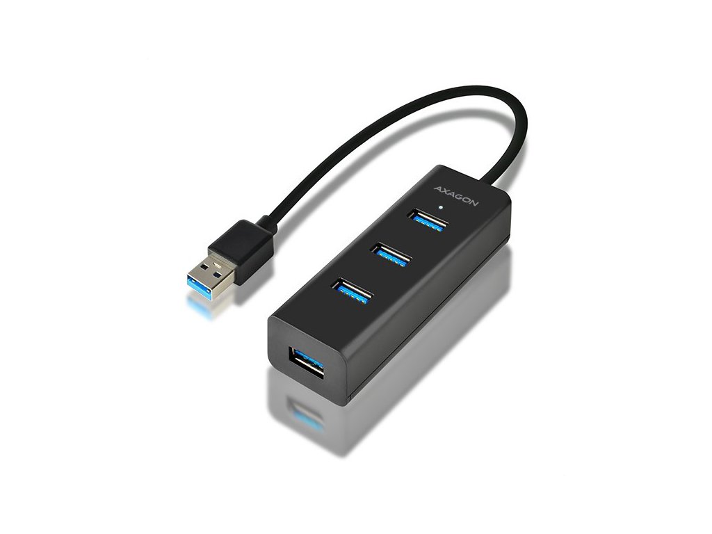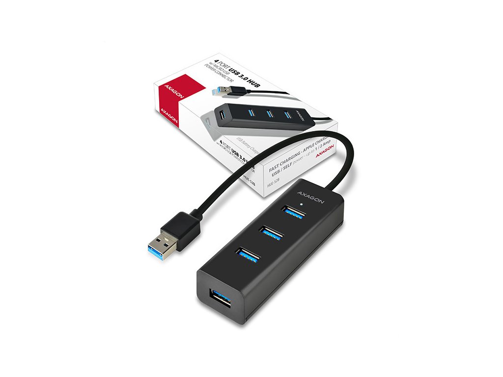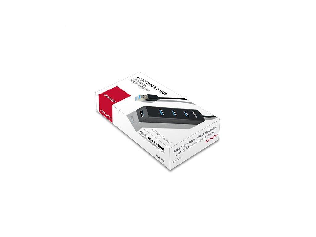4-portový USB 3.0 hub AXAGON HUE-S2B s možností externího napájení a podporou rychlonabíjení na všech portech. Lehký malý rozbočovač s elegantním matným plastovým tělem připojí snadno a rychle k počítači až čtyři USB zařízení současně. Napevno uchycený USB kabel dostatečné délky 30 cm ideální pro použití s notebooky.Velkou výhodou je možnost externího napájení hubu z jakékoliv nabíječky mobilních zařízení s micro USB konektorem. Nevyužitá nabíječka tak zadarmo udělá z tohoto USB hubu rychlonabíjecí hub. Mobilní telefony, tablety, powerbanky a další zařízení lze nabíjet proudem až 2A (závisí na použité nabíječce) v kterémkoliv portu hubu díky podpoře USB Battery Charging 1.2. Podpora nabíjení tabletů iPad i bez přídavného napájení proudem cca. 1A (přímo z USB 3.0 portů na počítači většinou iPad nabíjet nelze). Může fungovat i jako samostatný charging hub a nabíjet USB zařízení z napájecího adaptéru i po vypnutí nebo odpojení počítače.