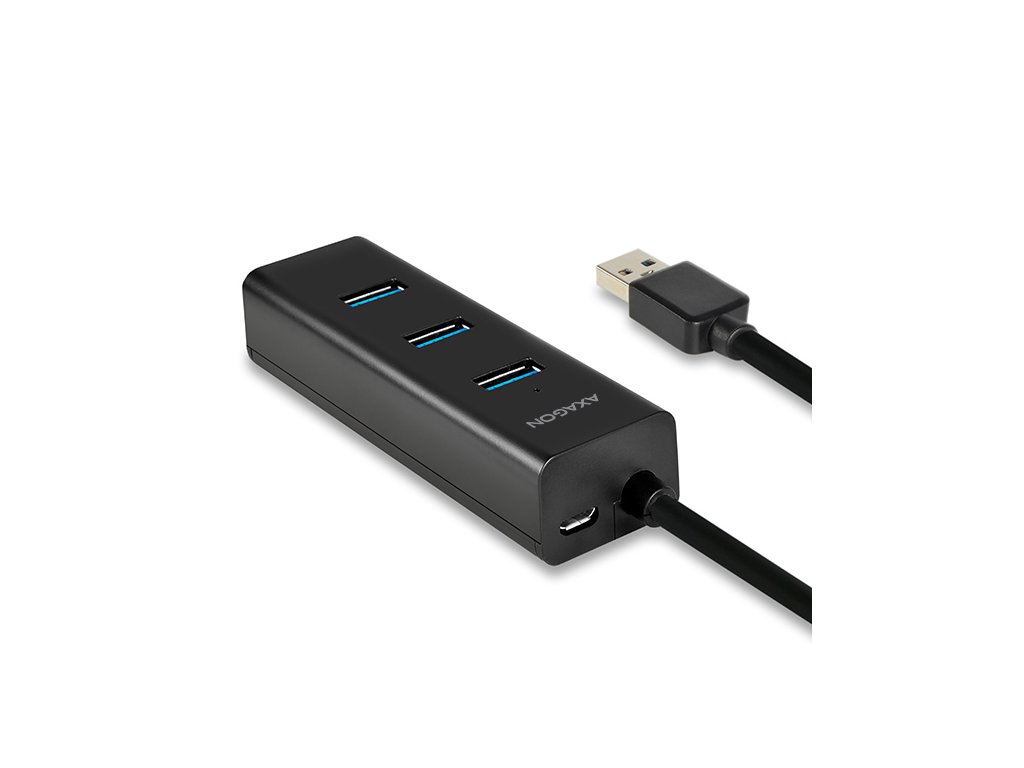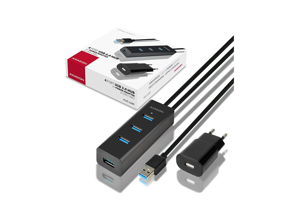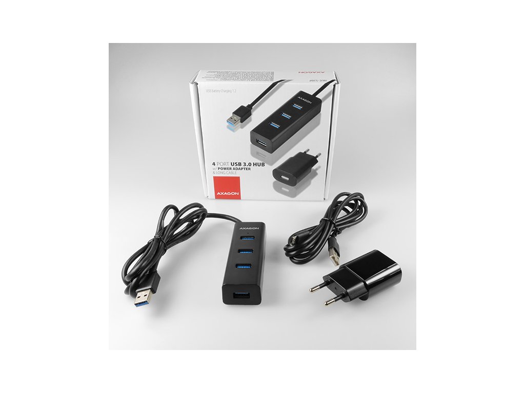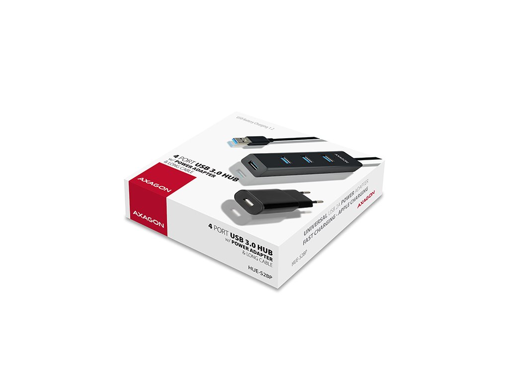 4-portový USB 3.0 hub AXAGON HUE-S2BP s USB kabelem dlouhým 1.2m, napájecím zdrojem a podporou rychlonabíjení na všech portech.Lehký malý rozbočovač s elegantním matným plastovým tělem připojí snadno a rychle k počítači až čtyři USB zařízení současně.