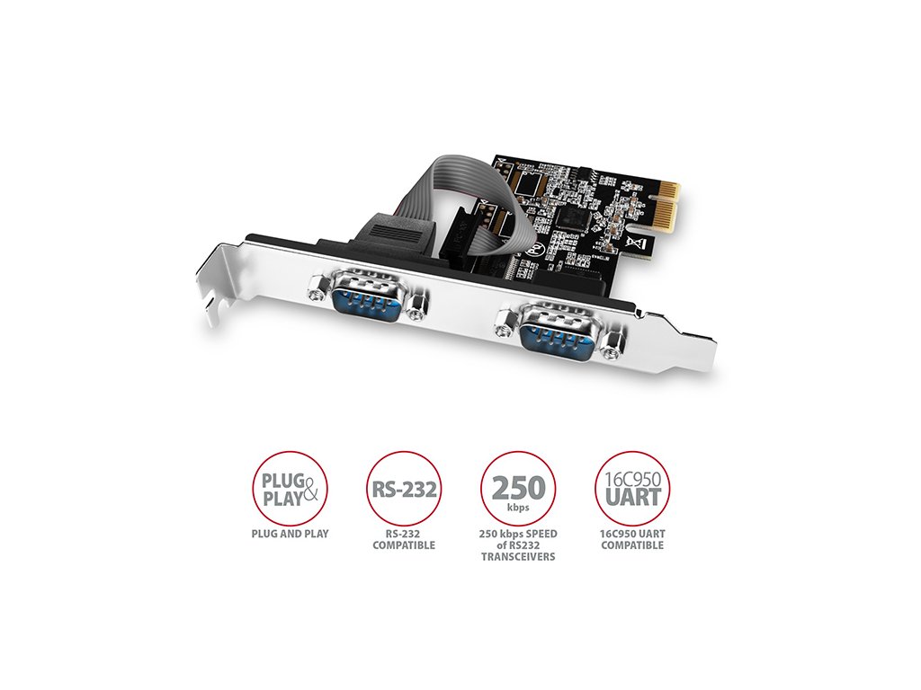 PCI-Express karta AXAGON PCEA-S2N rozšíří stolní počítač o dva sériové RS-232 porty s DB-9 konektory.Vysoký výkon, bezproblémová kompatibilita a široké možnosti nastavení portů jsou zajištěny použitím osvědčeného čipsetu společnosti ASIX.