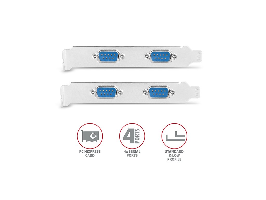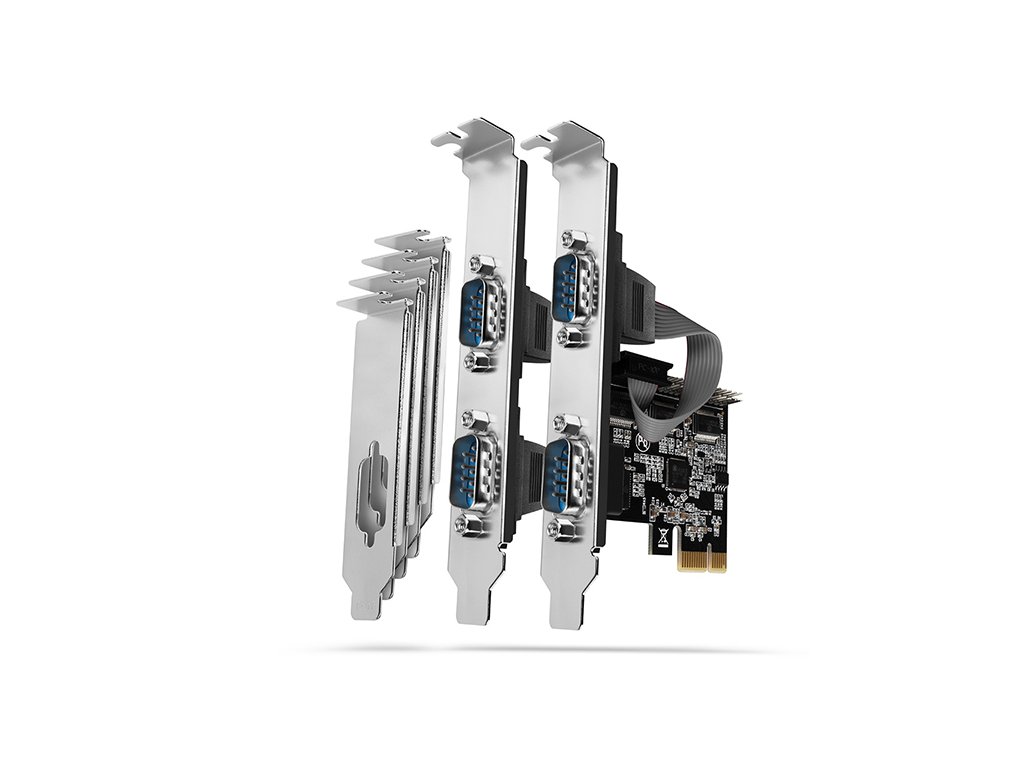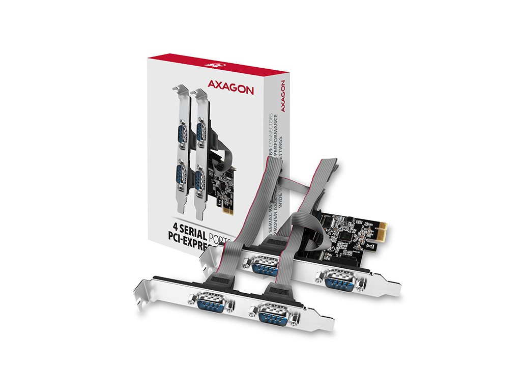 PCI-Express karta AXAGON PCEA-S4N rozšíří stolní počítač o čtyři sériové RS-232 porty s DB-9 konektory.Vysoký výkon, bezproblémová kompatibilita a široké možnosti nastavení portů jsou zajištěny použitím osvědčeného čipsetu společnosti ASIX.