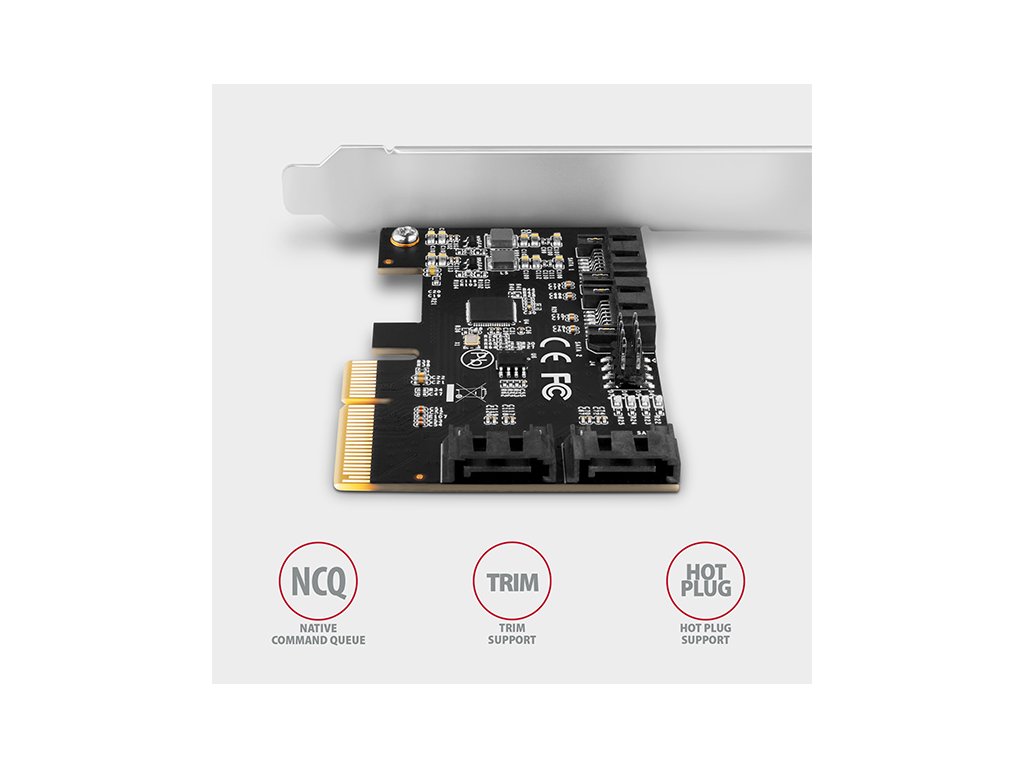 PCI-Express řadič AXAGON PCES-SA4X4 rozšíří stolní PC o čtyři SATA III porty s přenosovou rychlostí až 6Gb/s.Karta osazená čipsetem ASMedia nabízí nejen podporu specifikace SATA 3.0, ale i dalších SATA technologií jako Hot-Plug, Native Command Queue (NCQ), TRIM nebo Port Multiplier. Jednoduchá instalace bez nutnosti instalace ovladačů ve většině operačních systémů.